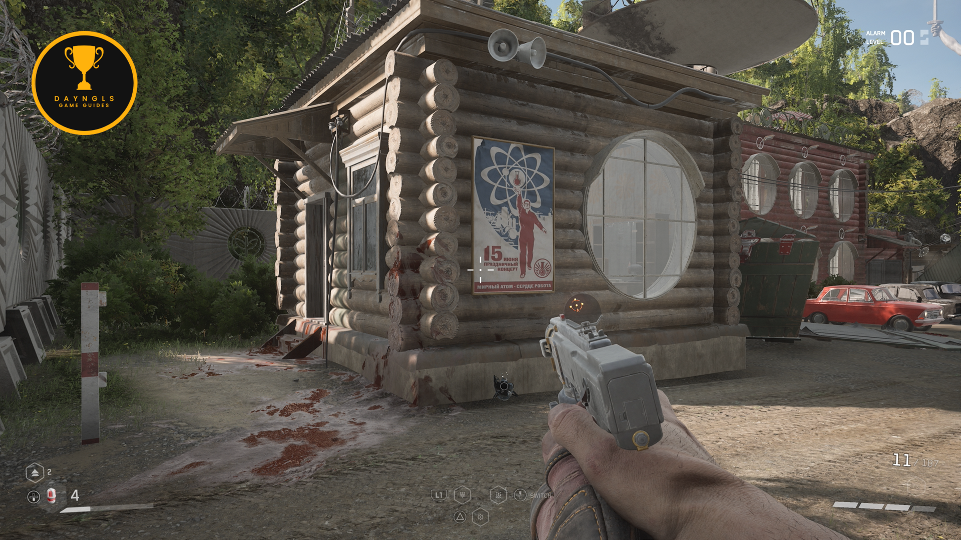 Head just north of Testing Ground 10 and look for a building made of logs with a red flag on it. Use the yellow pipe on the back of the building to climb up to the roof. Go into the room on the roof and interact with the terminal to hack the camera nearby.