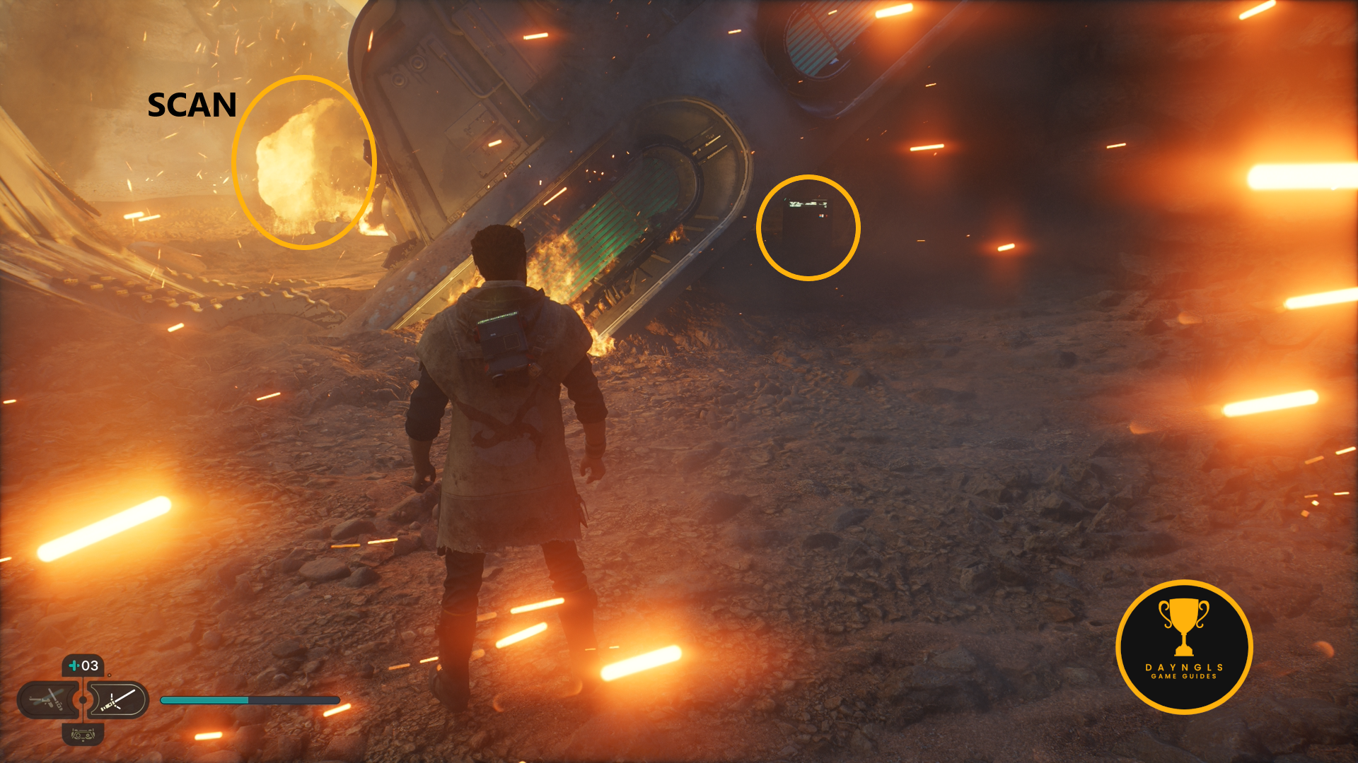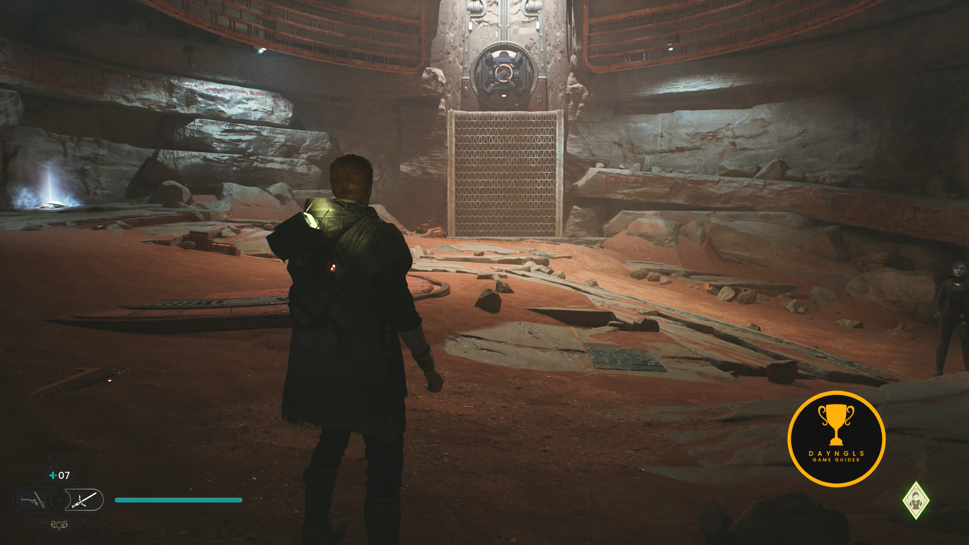 As the game begins, you’ll need to follow the CSF Officers. Follow them to your first combat encounter where you’ll learn the basics of combat in Jedi: Survivor. After a short scene, you’ll then need to platform your way up and around until you’re shot at and fall below.