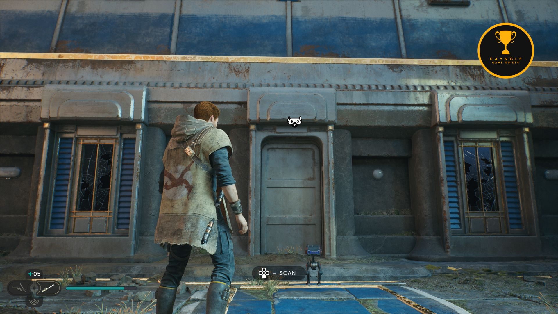 There will be a group of three Stormtroopers at the top. Dispose of them and there will be graffiti on the wall that you can scan with BD. Scan it to get the Squatter Camp data entry.