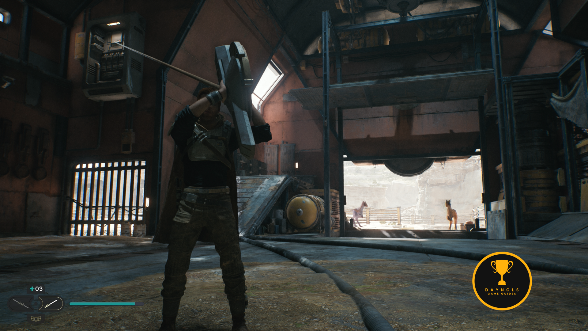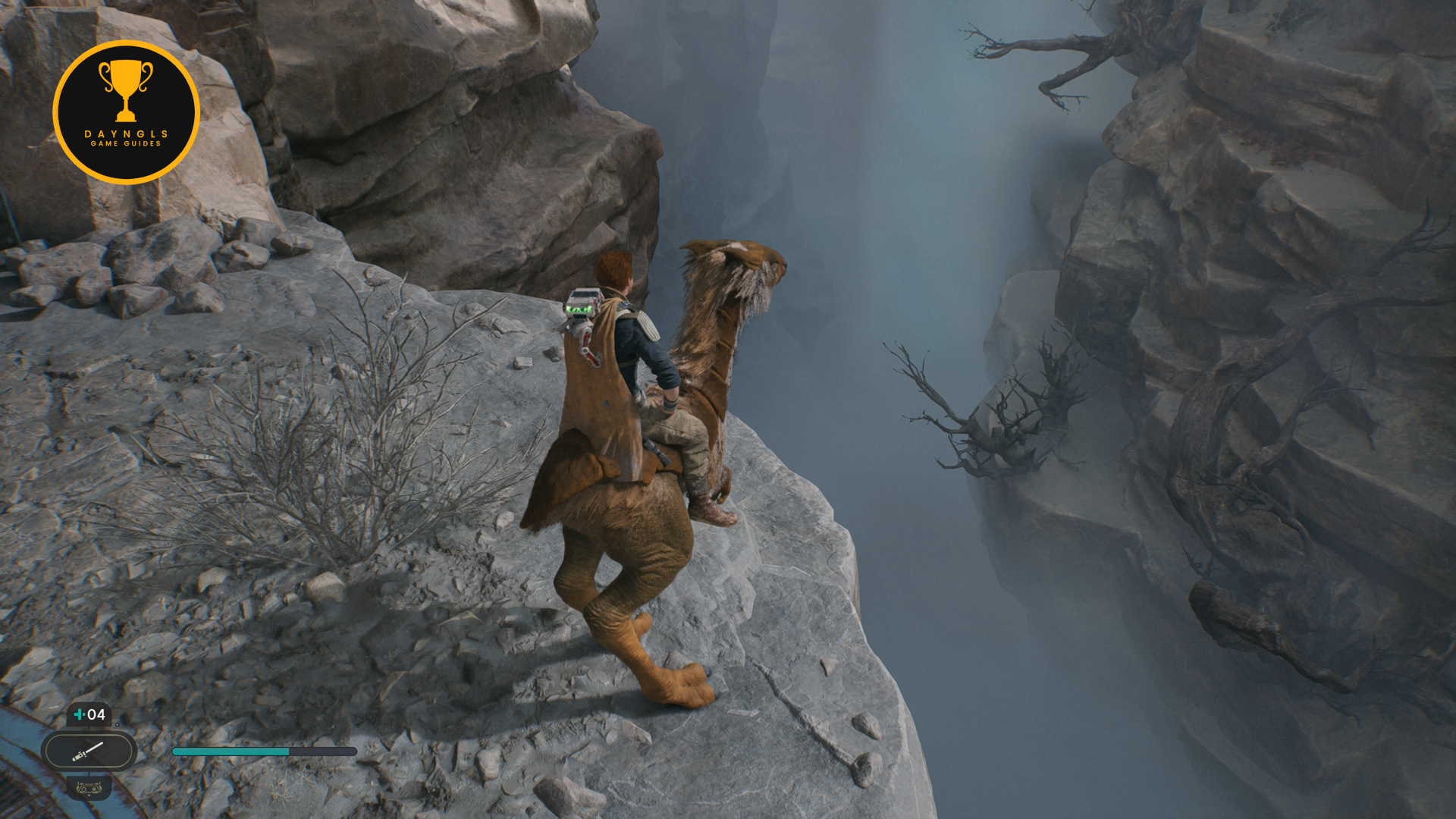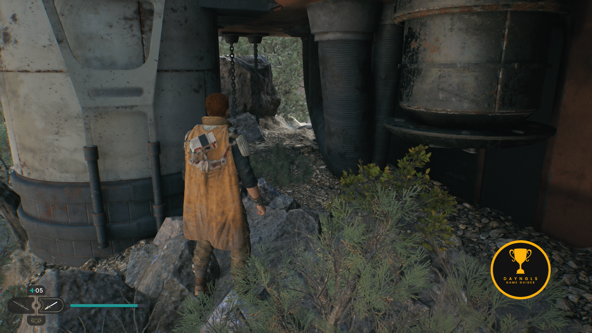 As you follow Bode, there will be rope on the right that you can interact with. Use your lightsaber to cut it which will create a shortcut for coming through here later on.