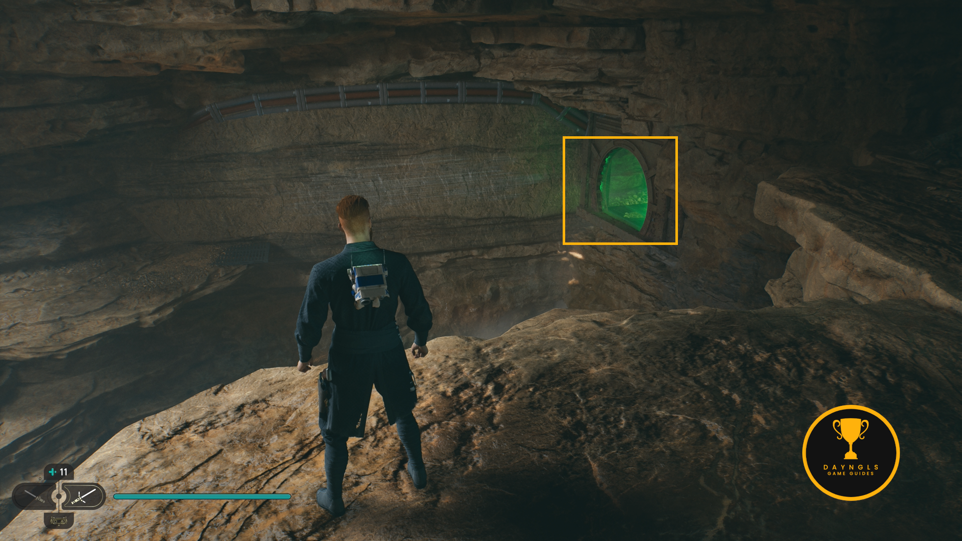 Enter the Smuggler’s Tunnels through Cal’s room. Go through until you see the second round green barrier. Dash through it.