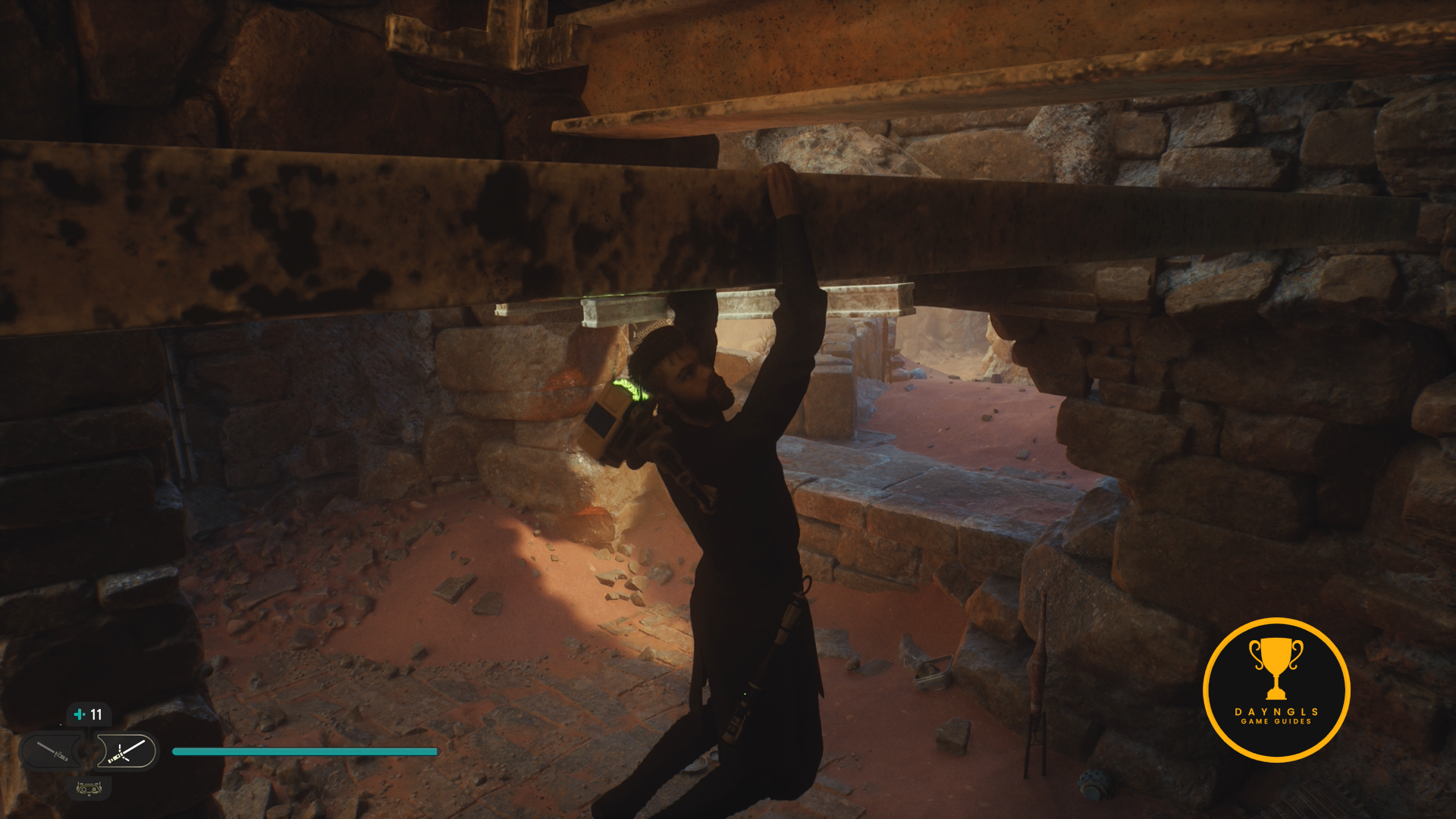 Walk on to the skinny pillar and hang from it. Don’t drop to the ground. Climb over and jump to the pillars on your left to reach the ledge on the other side of the ruins.