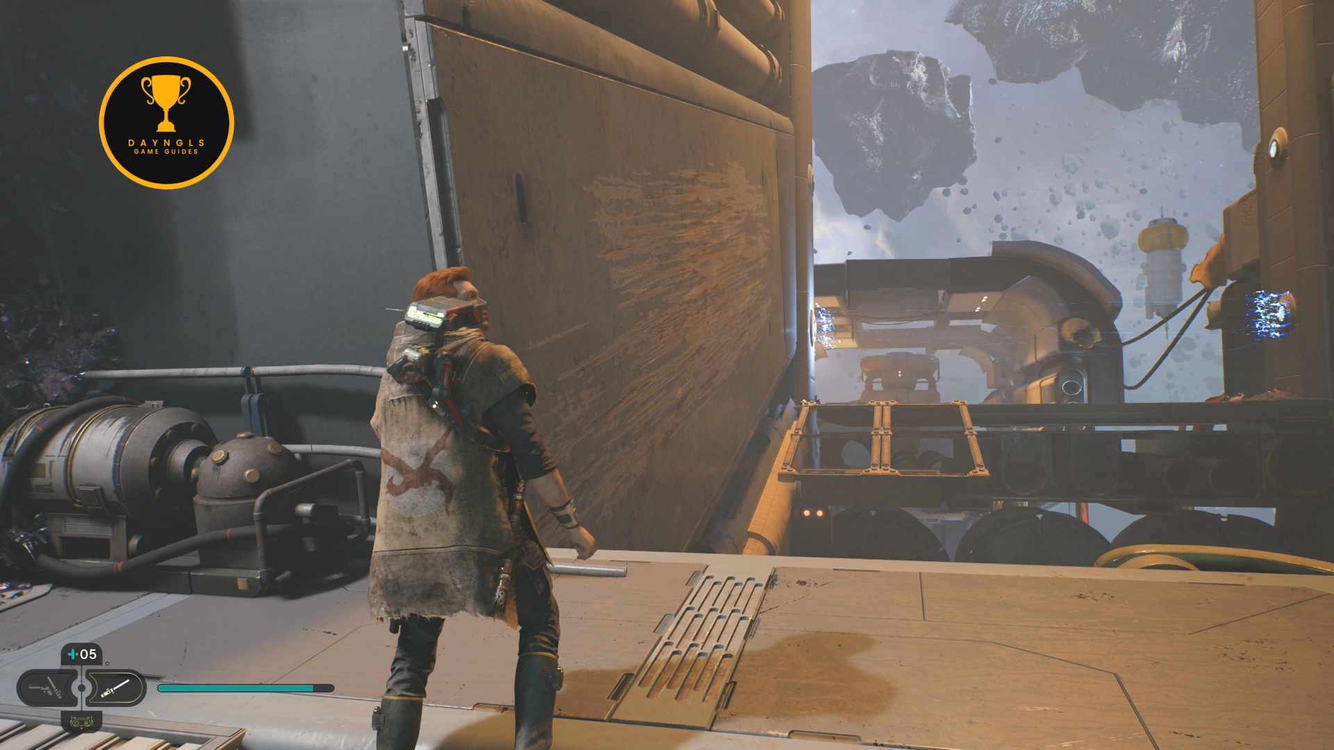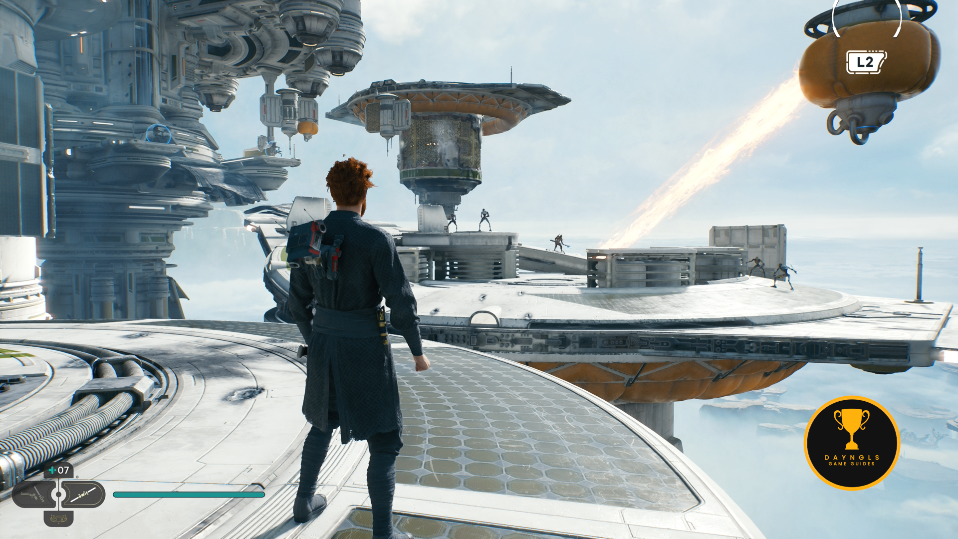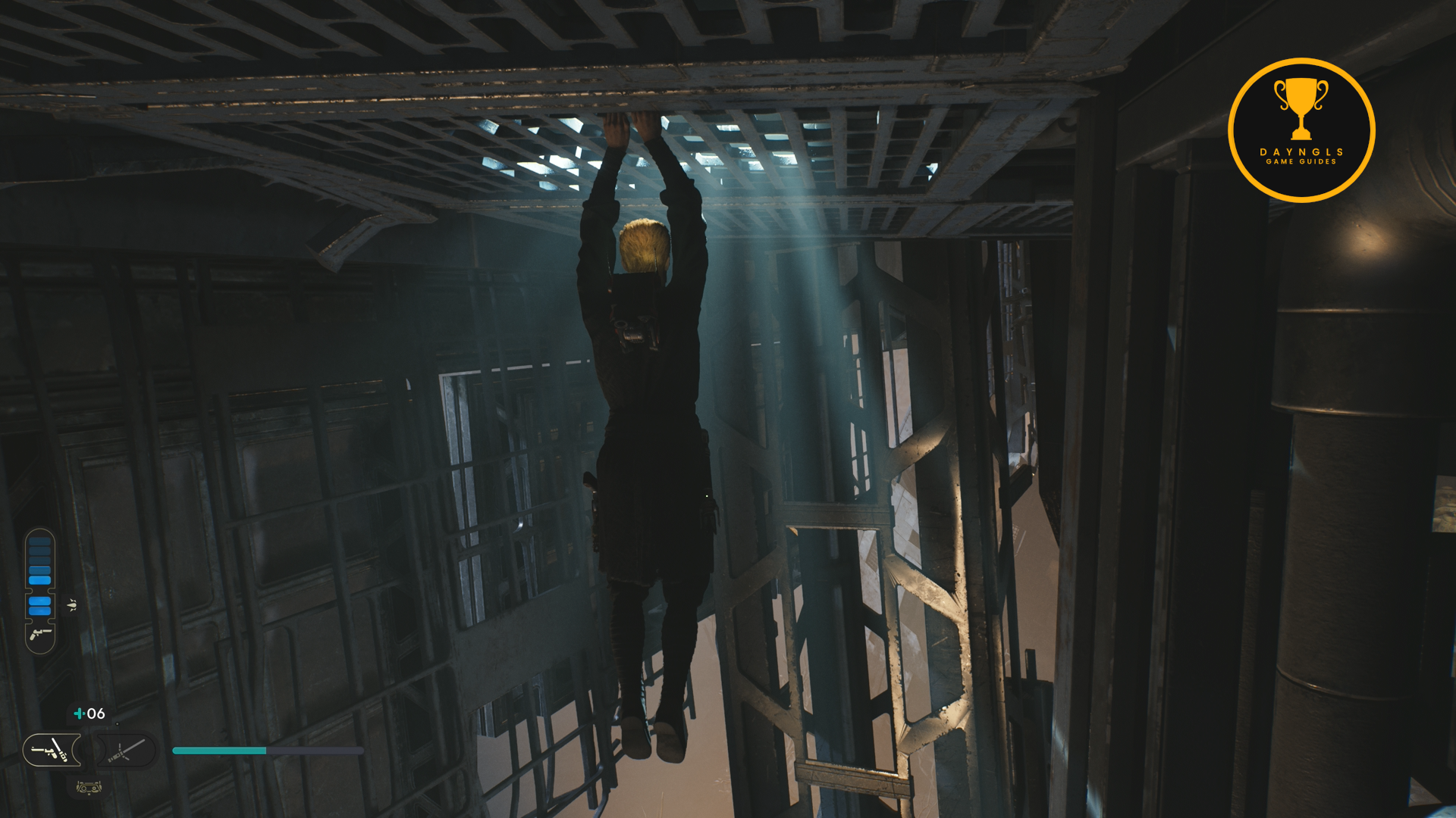 As the game begins, you’ll need to follow the CSF Officers. Follow them to your first combat encounter where you’ll learn the basics of combat in Jedi: Survivor. After a short scene, you’ll then need to platform your way up and around until you’re shot at and fall below.