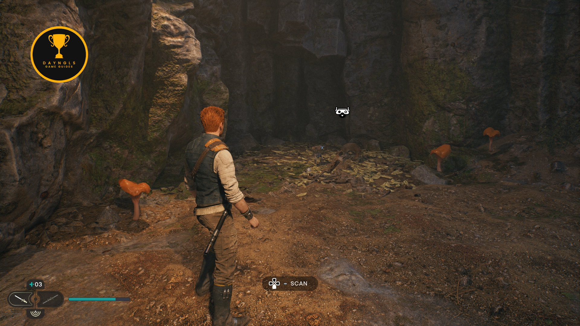 Grab the shard and then attack the enemies. Kill them and then make sure to scan the Raider Grunt to add it to your Tactical Guide. Continue deeper into the cave and you’ll come to a scannable object on the ground to your right.