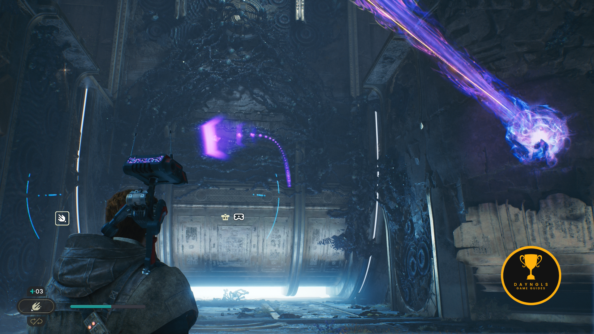 From the main cube, head forward. On the next platform, look up and force pull the metal extension down.