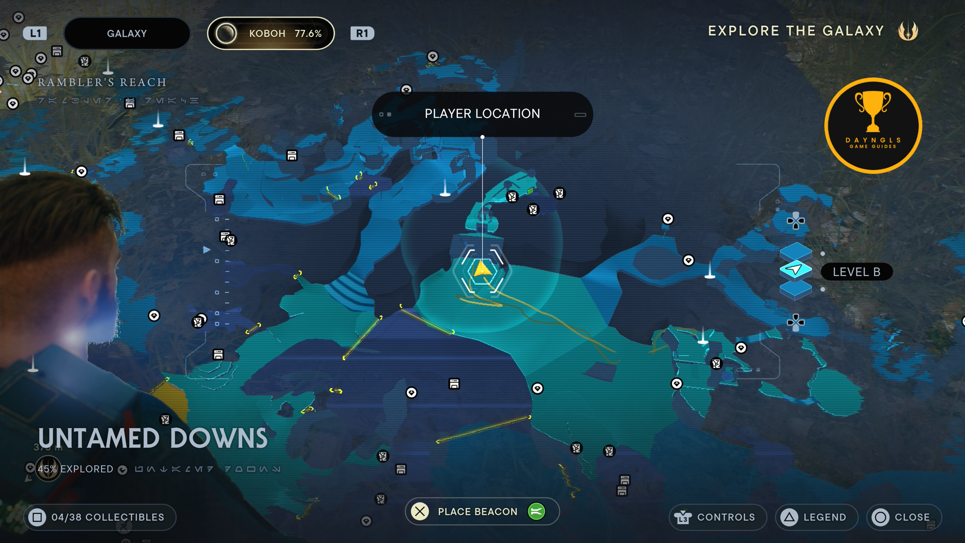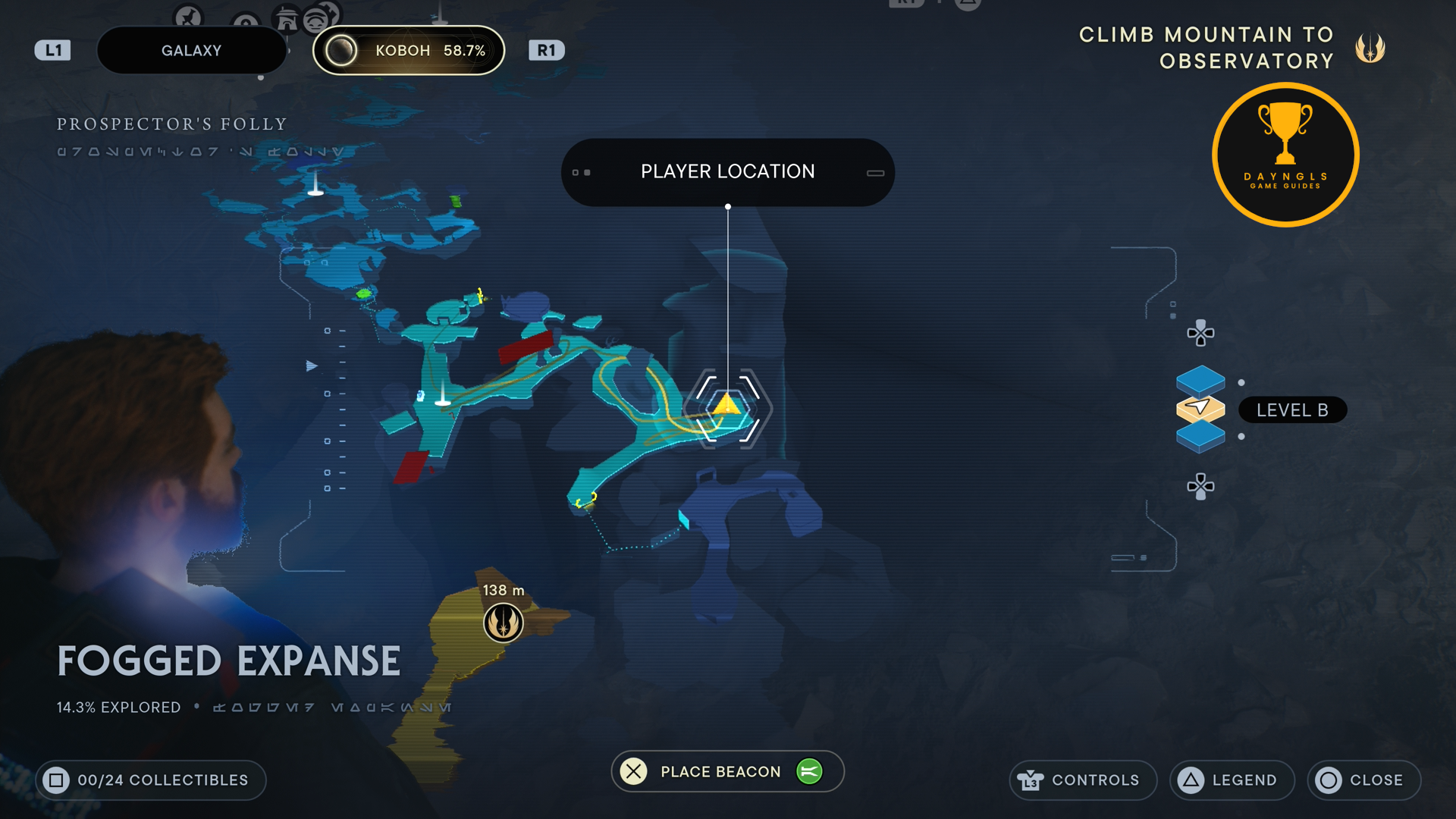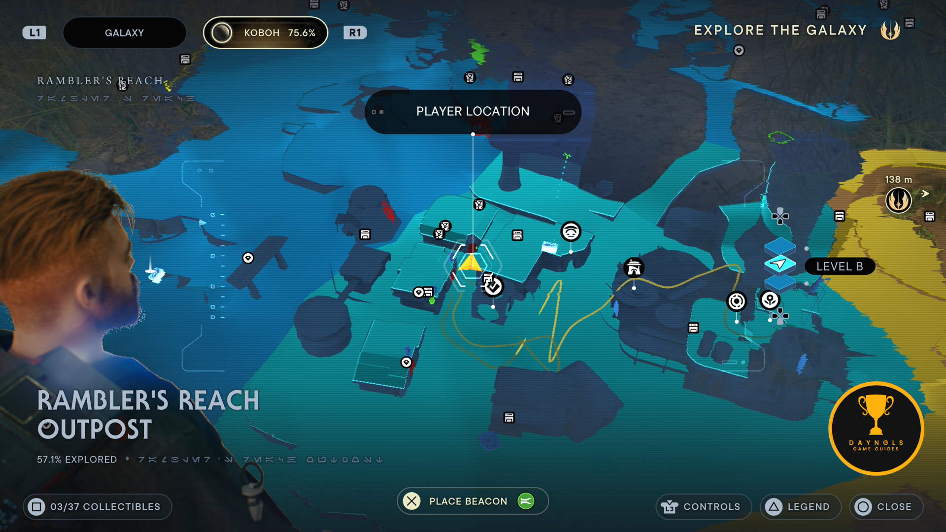 As you land on Koboh, follow the path until you shimmy through the wall and then use the BD Visor. With that done, head down the path to the right and ride the elevator down.