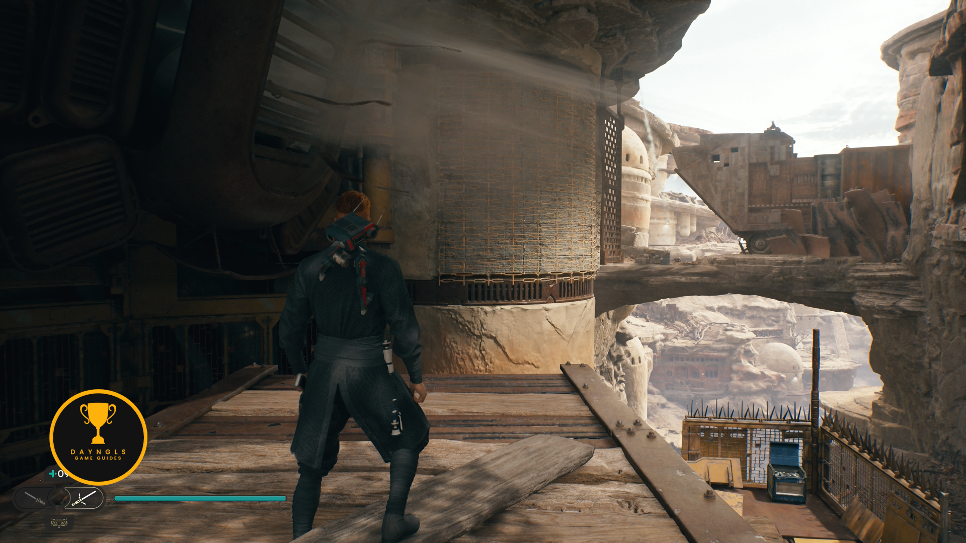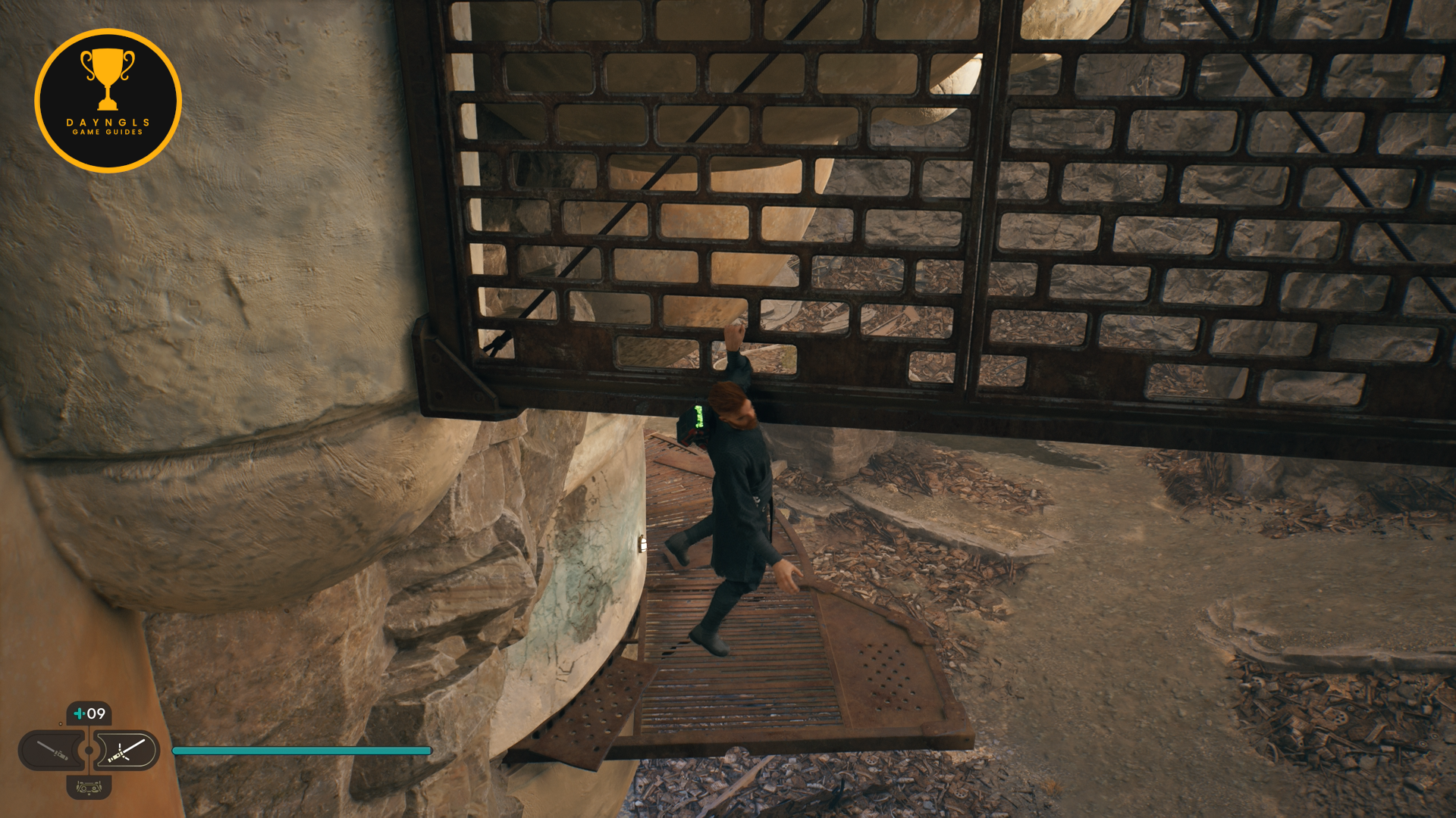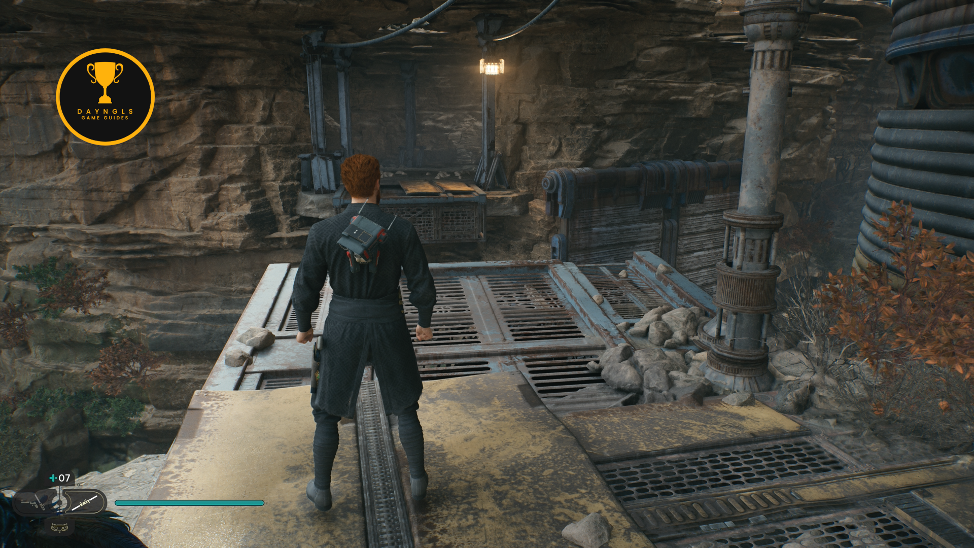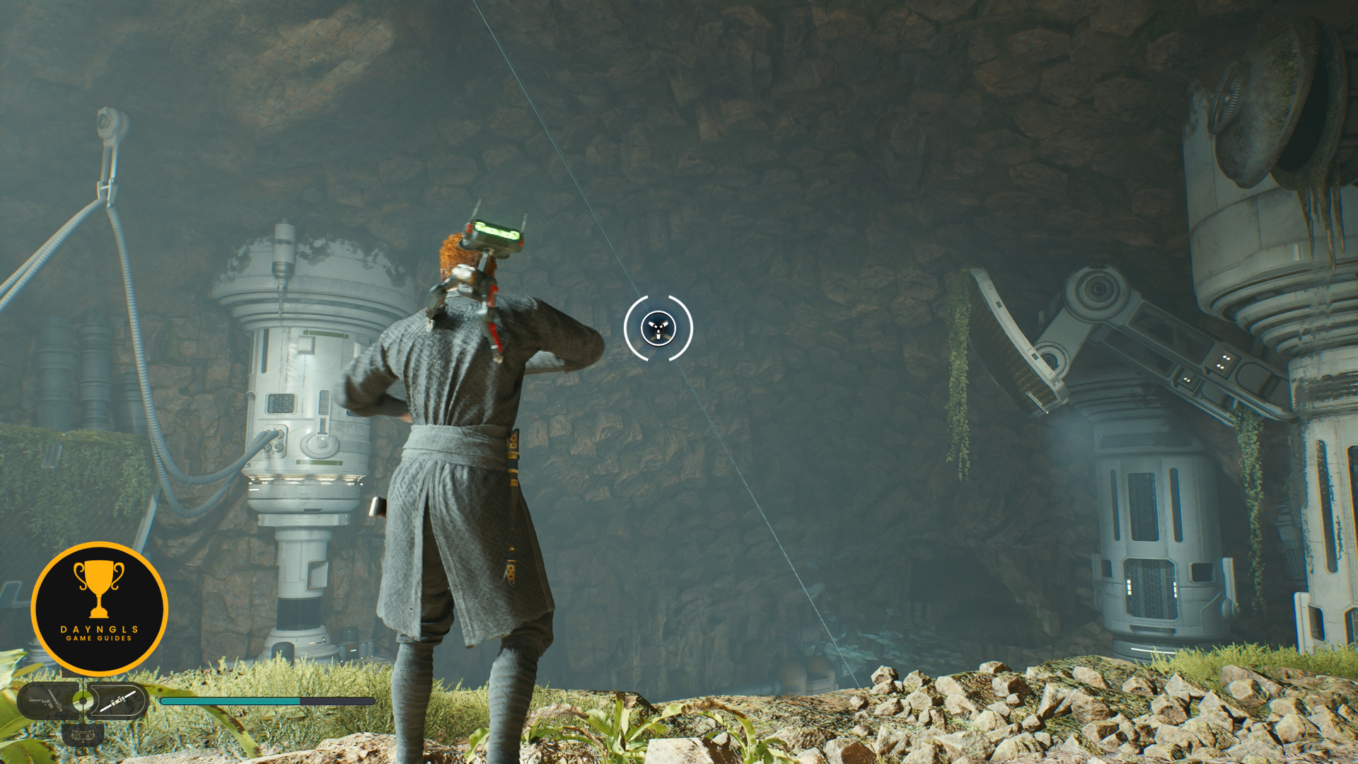 As you follow Bode, there will be rope on the right that you can interact with. Use your lightsaber to cut it which will create a shortcut for coming through here later on.