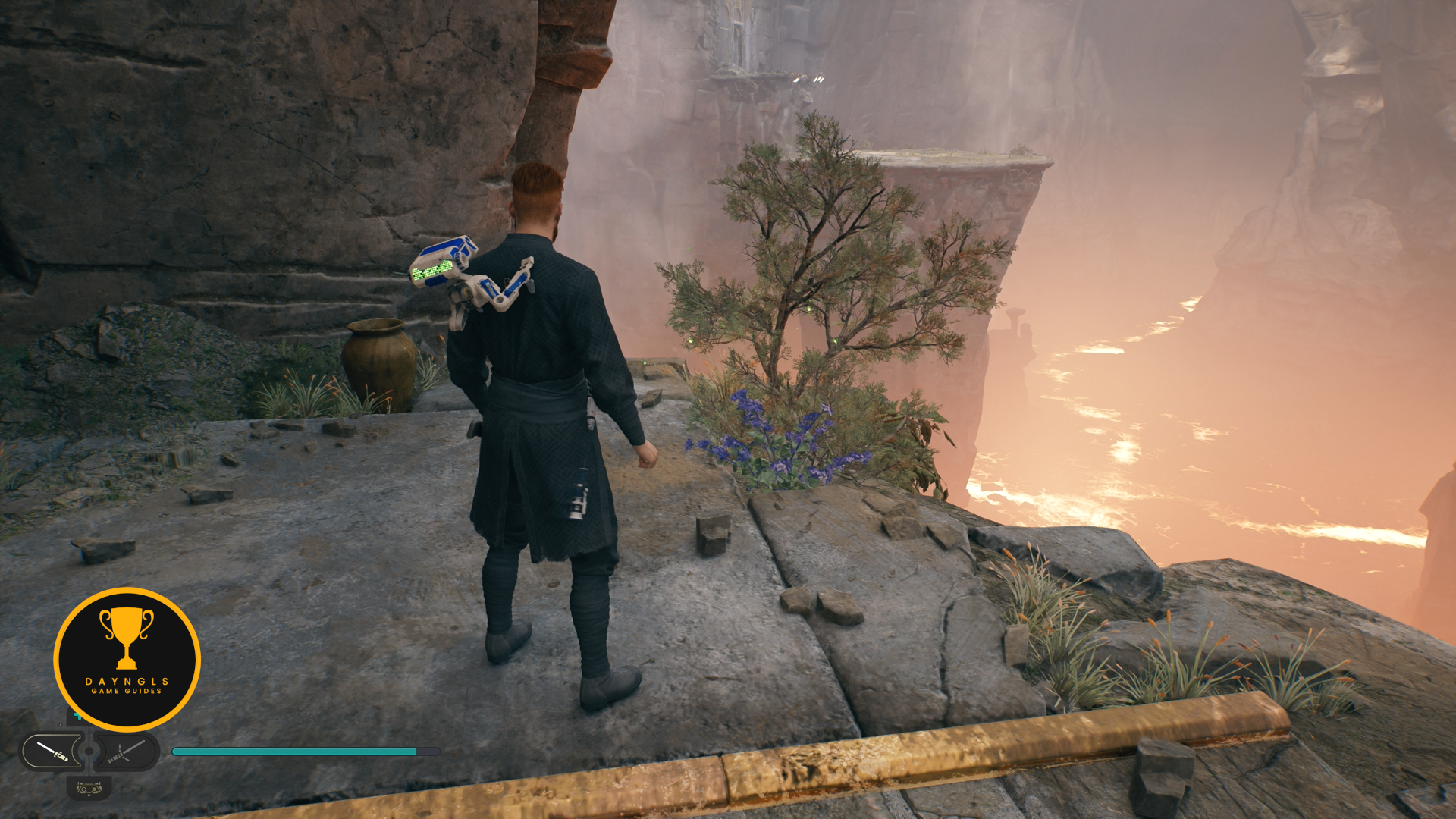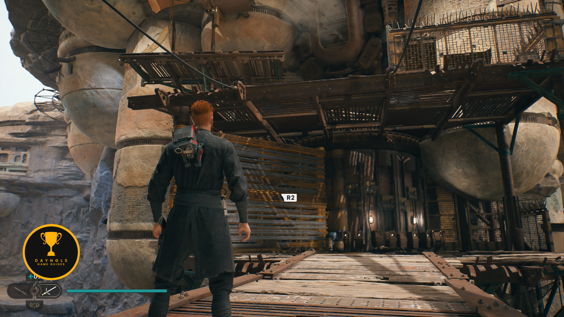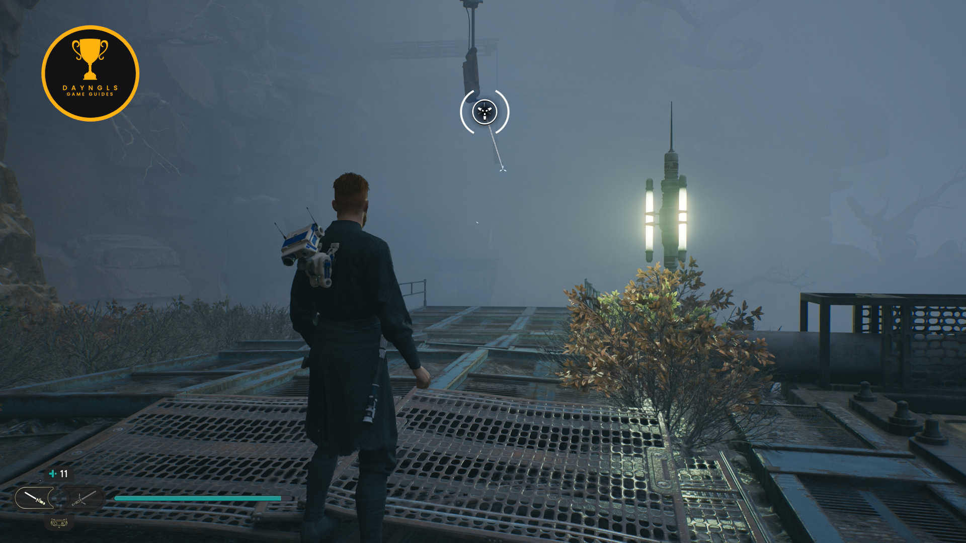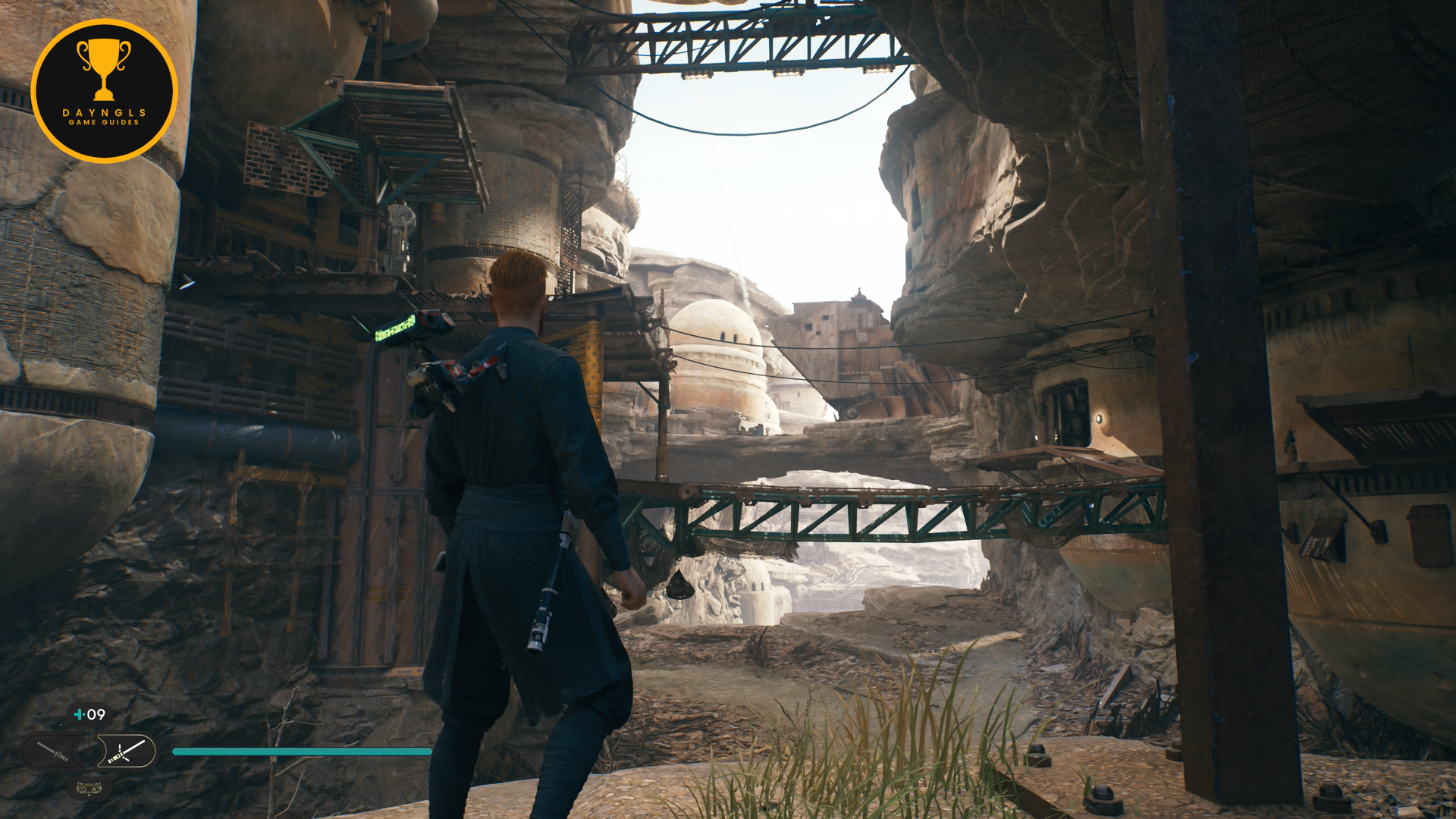 As you follow Bode, there will be rope on the right that you can interact with. Use your lightsaber to cut it which will create a shortcut for coming through here later on.