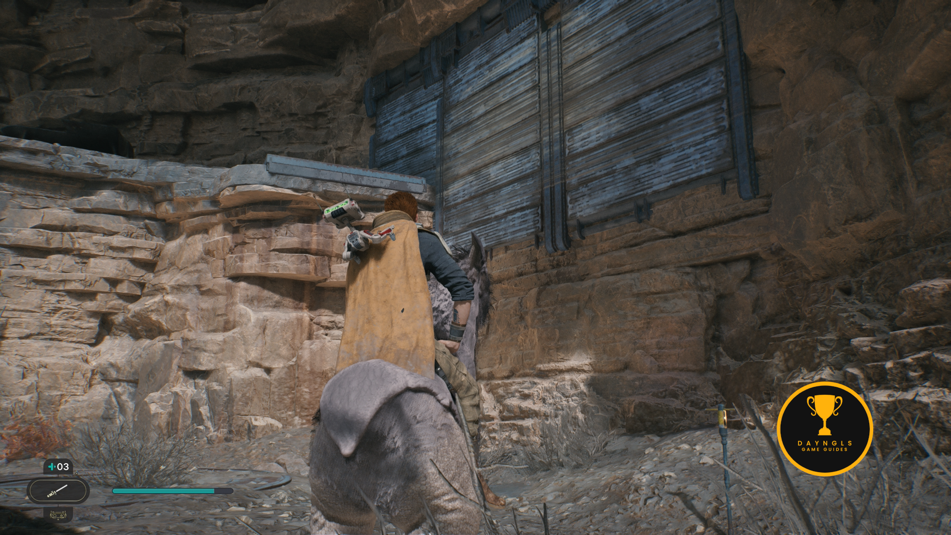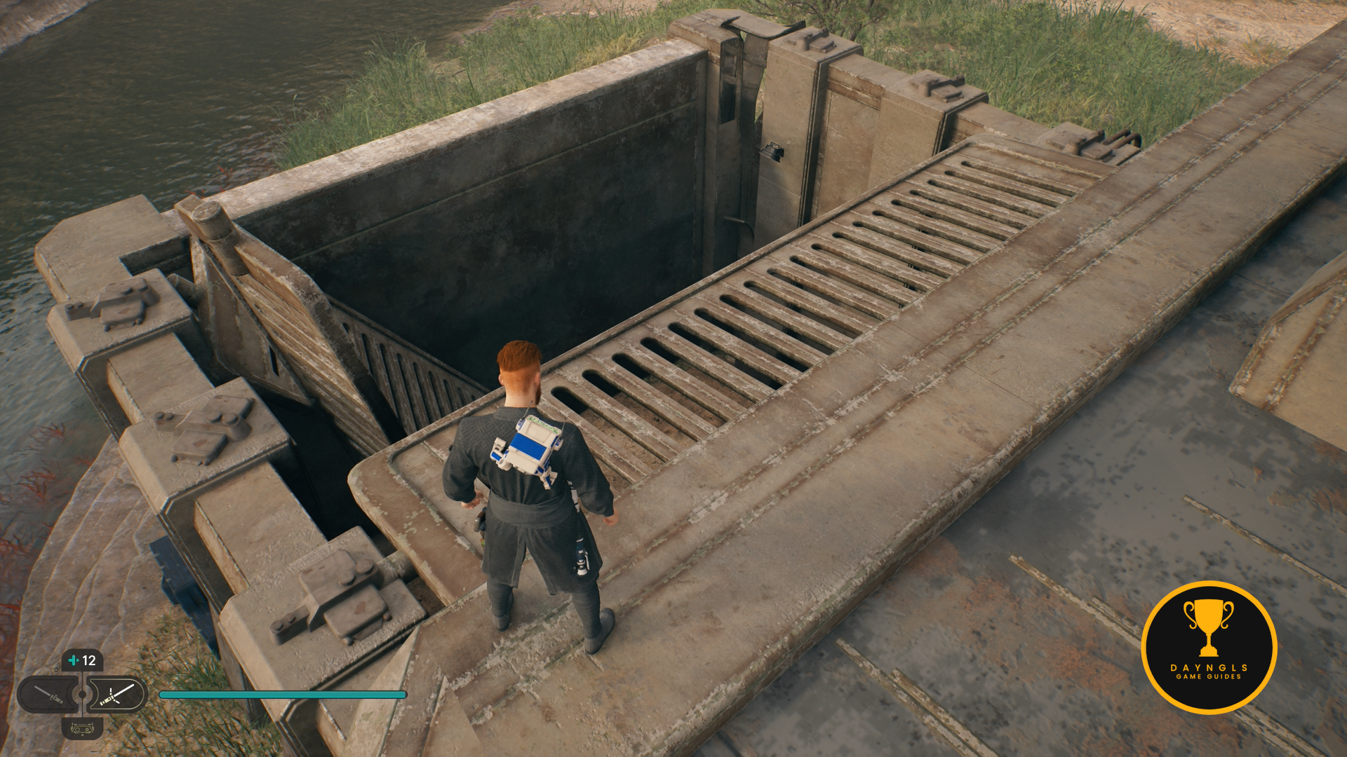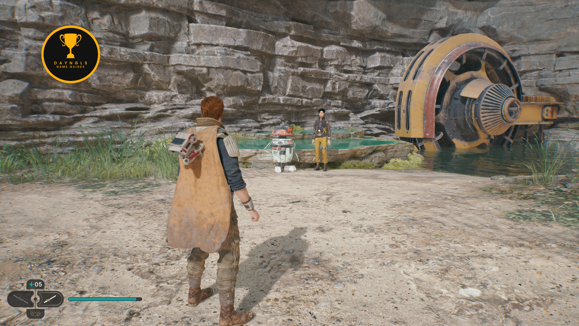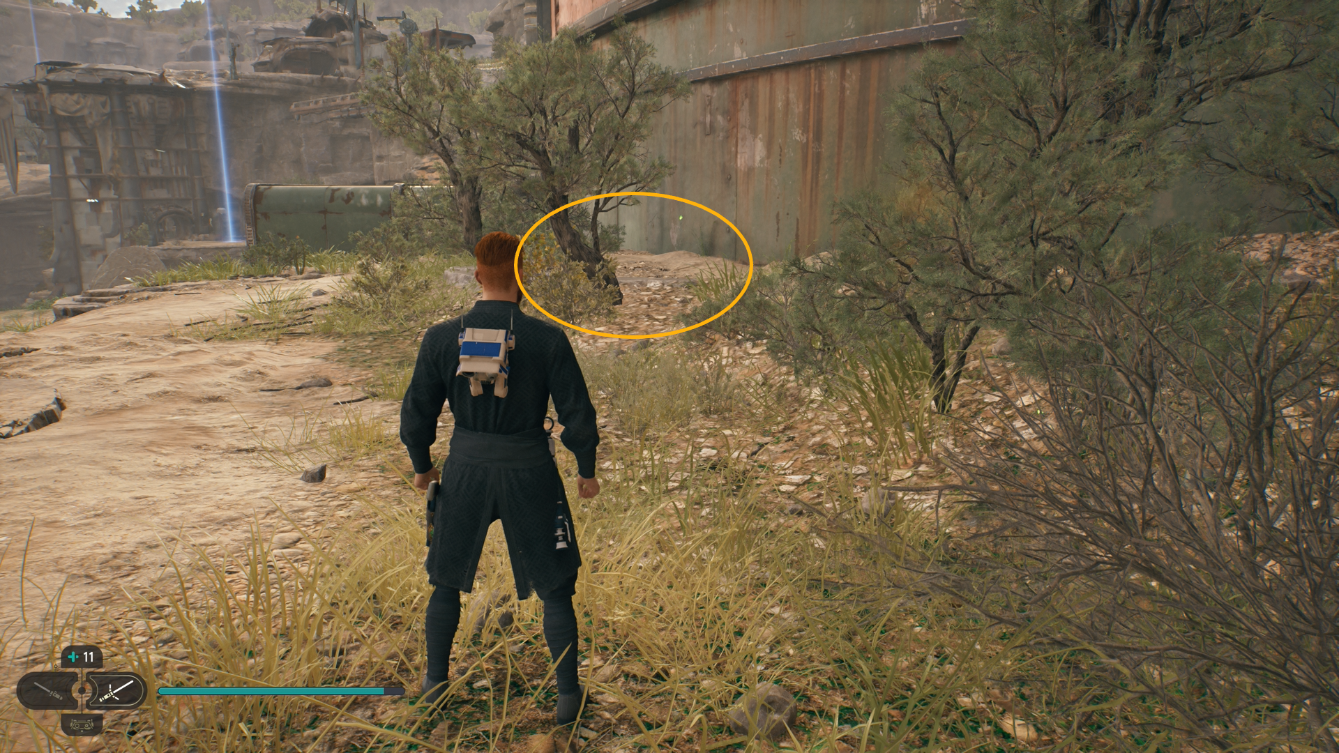 As you follow Bode, there will be rope on the right that you can interact with. Use your lightsaber to cut it which will create a shortcut for coming through here later on.