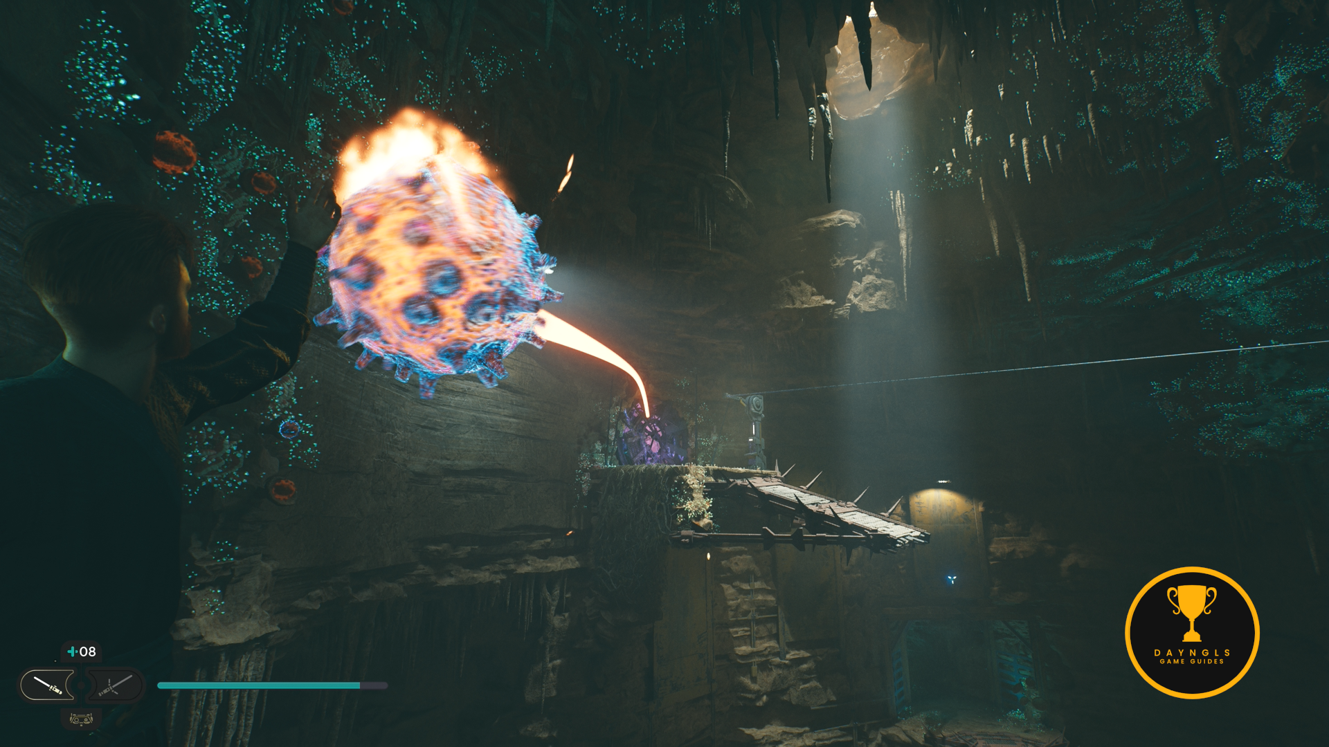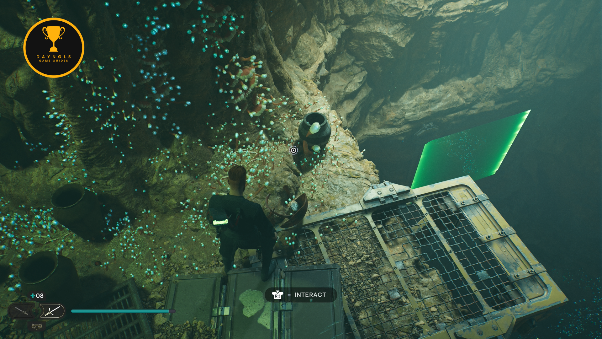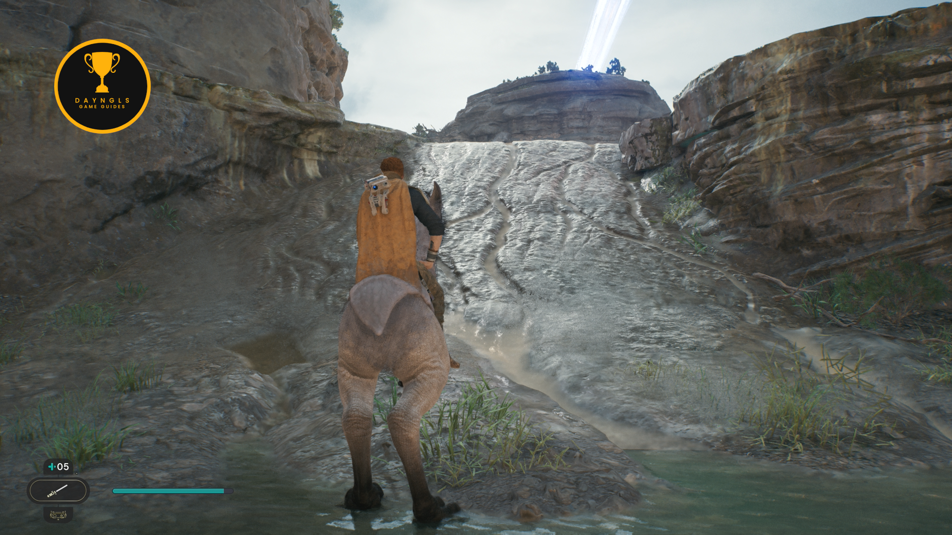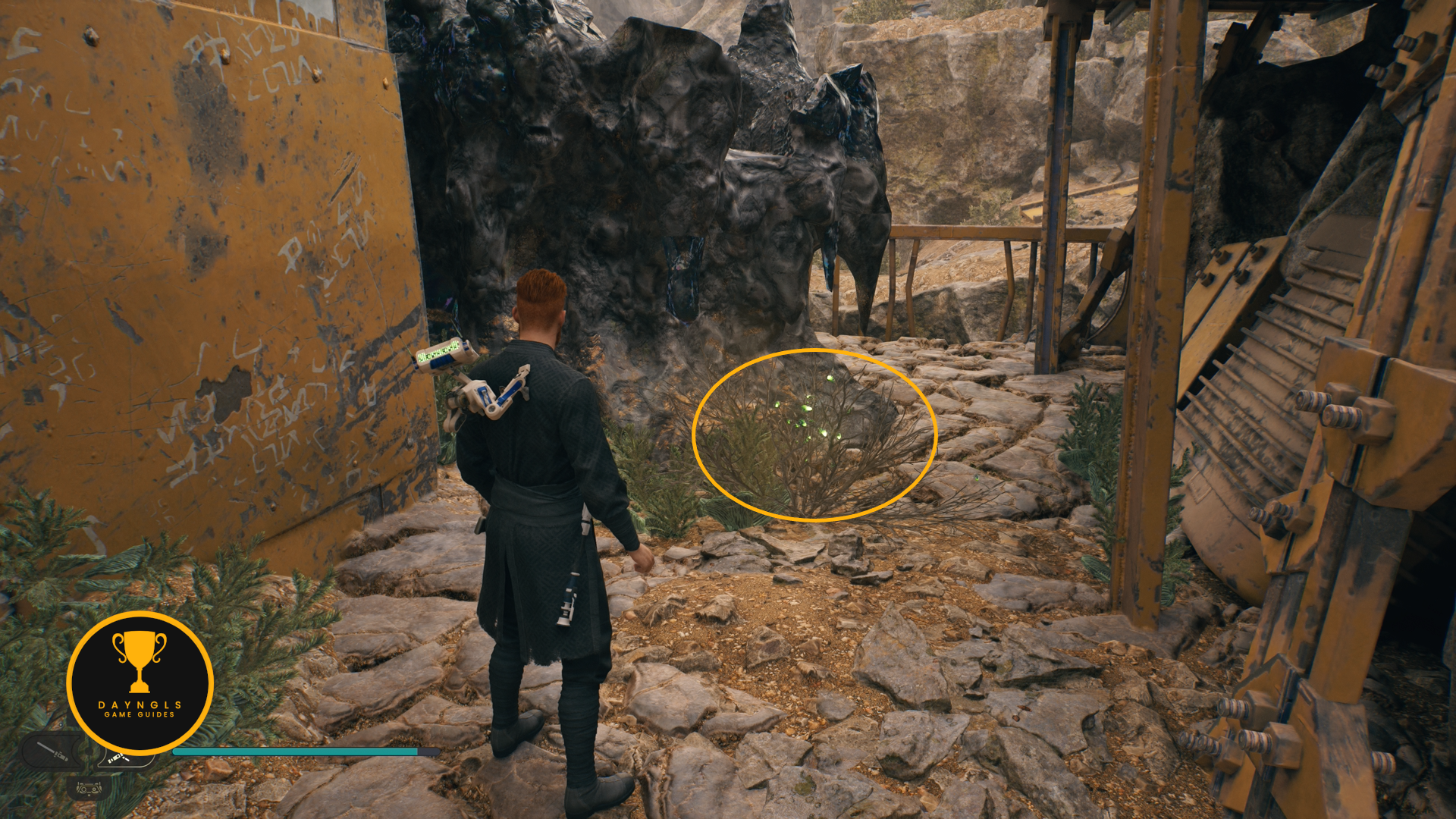 As you follow Bode, there will be rope on the right that you can interact with. Use your lightsaber to cut it which will create a shortcut for coming through here later on.