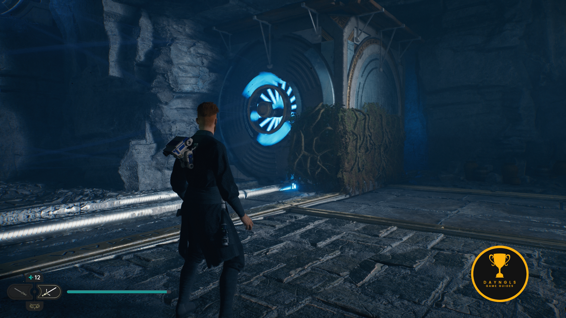 As you enter, look down to the left and you’ll see a cube you can force pull. Pull it over to you and it’ll reveal a tunnel behind the cube.