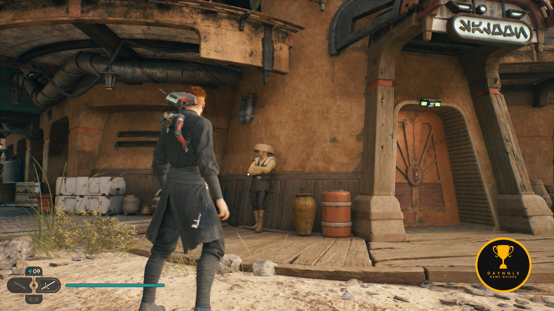 When you’re ready to leave, follow Bode up the stairs and across the gap by wall running across the neon sign. Enter the next room where you will encounter a Probe Droid and more Stormtroopers. Kill them and then go back to down to where you entered this room to find a bar. Interact with the bar to add Desi’s Noodles to your Databank.