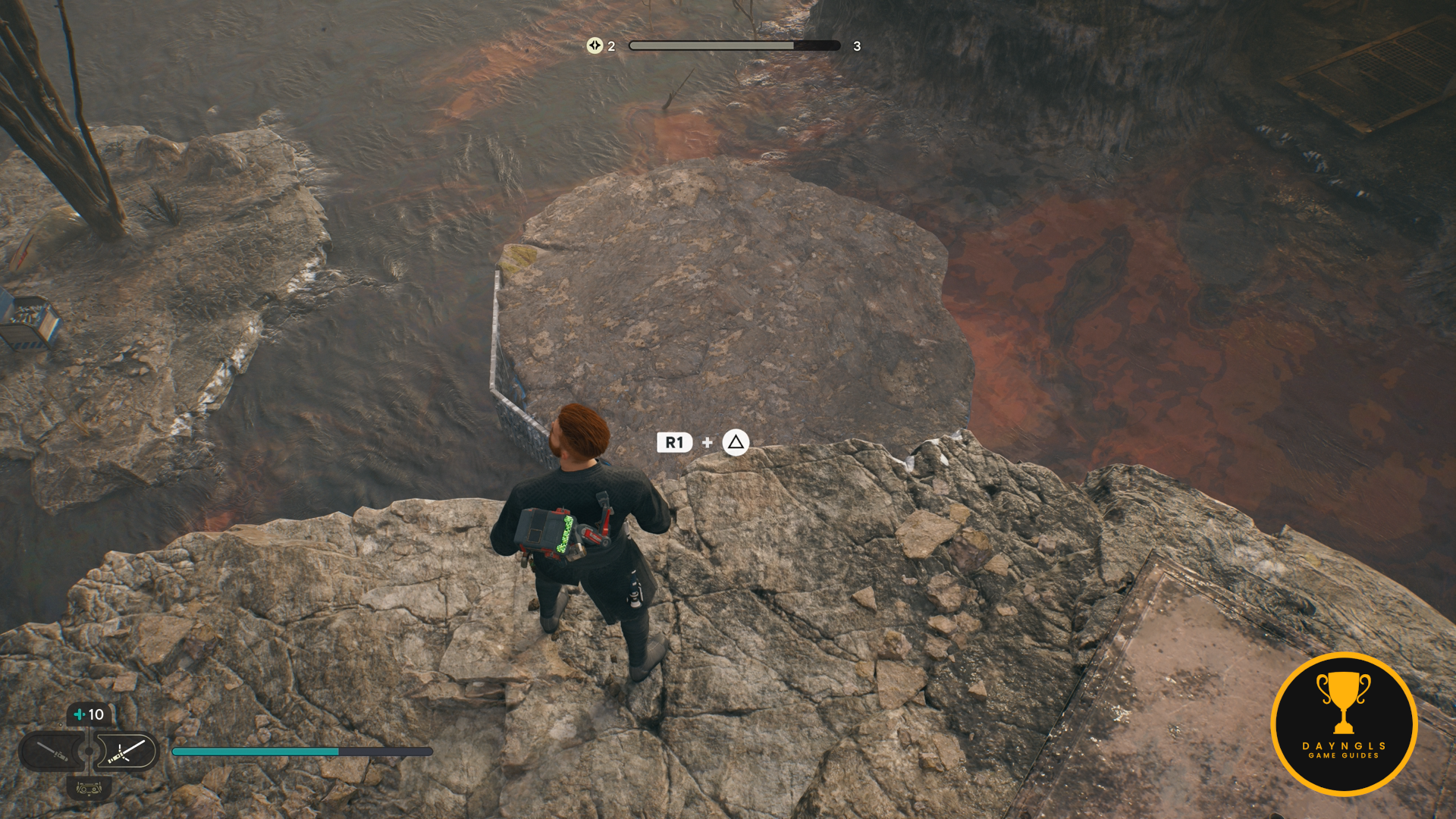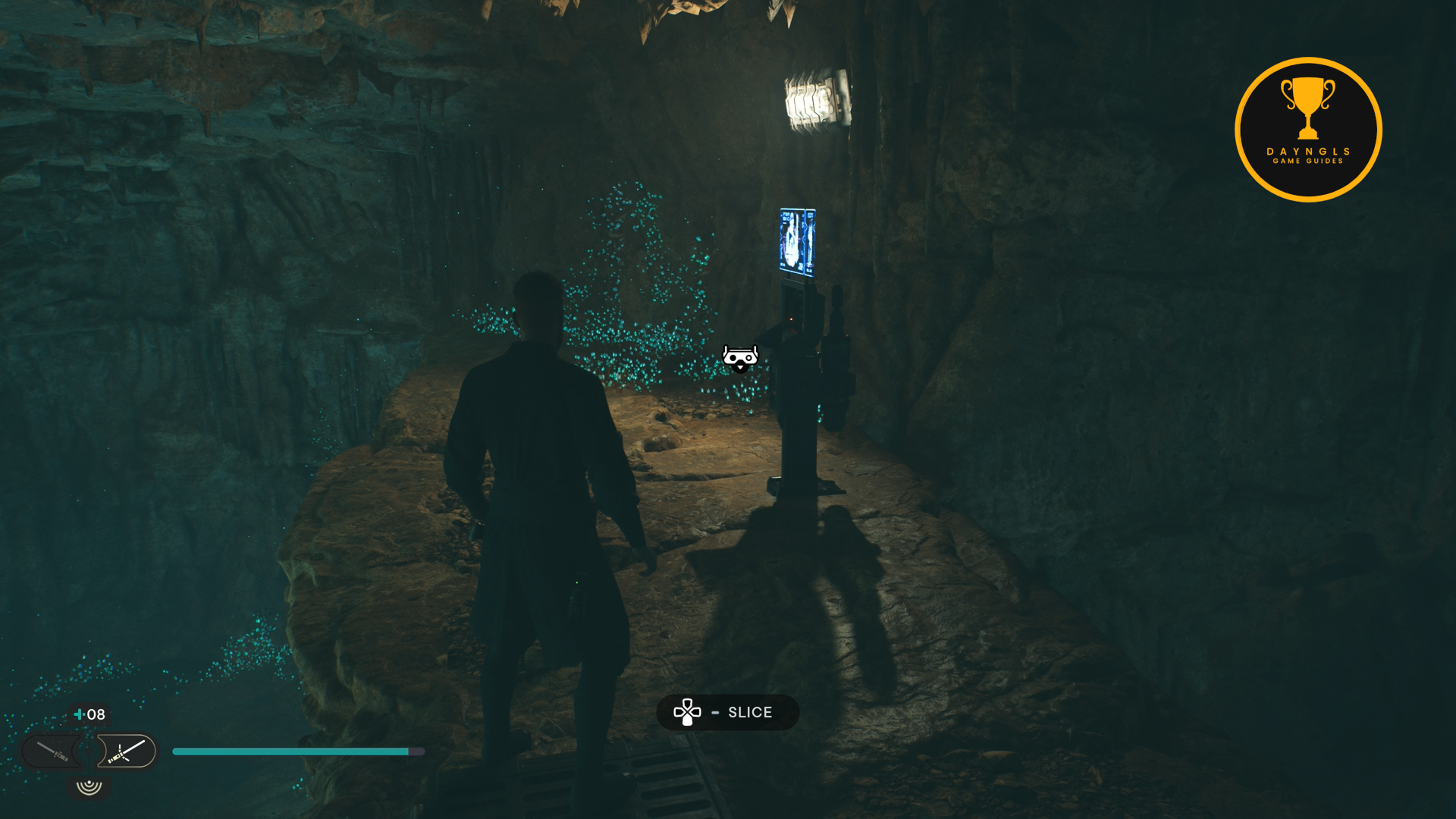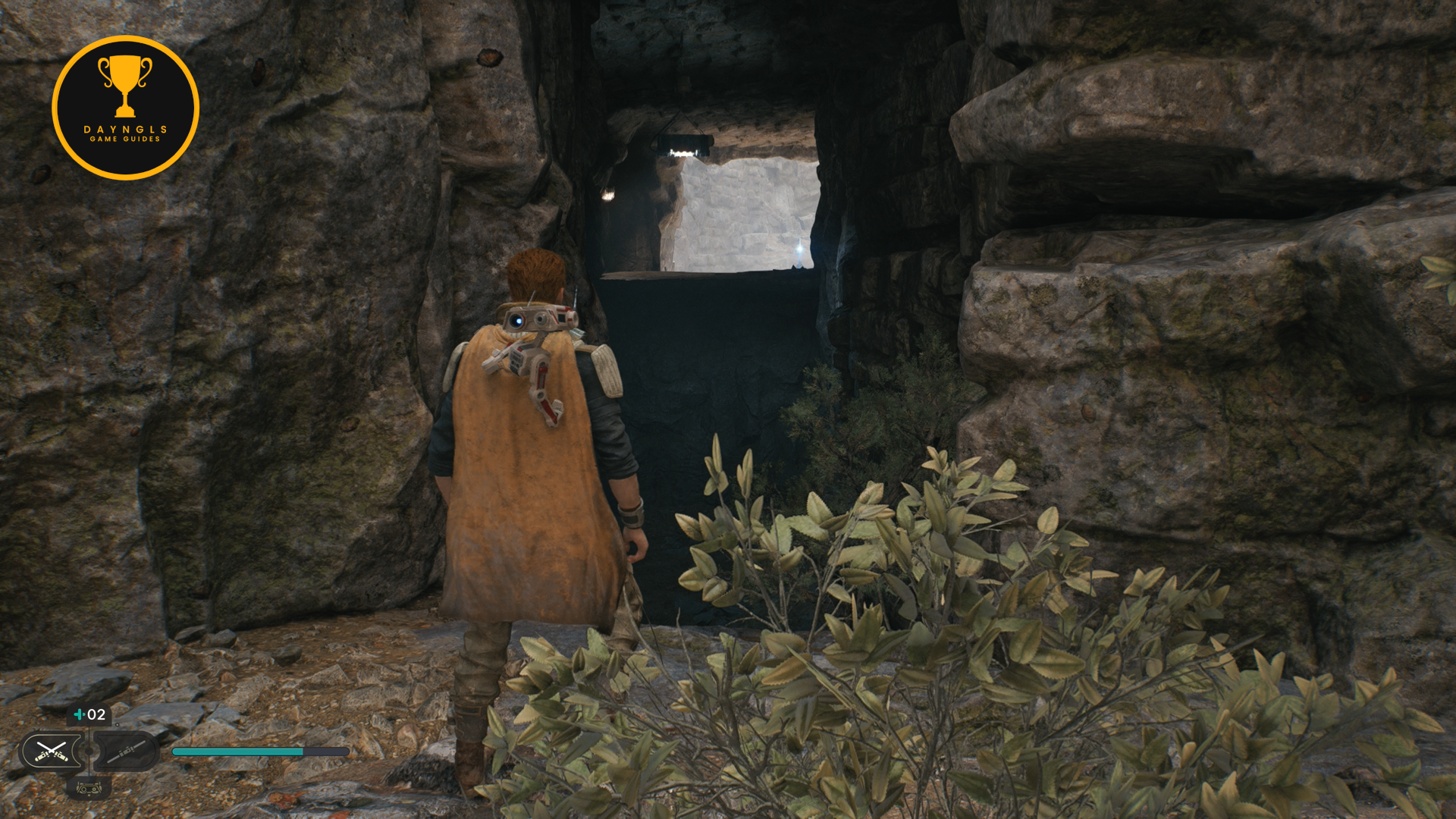 As you enter the cave, you’ll hear a conversation between a Raider and Droids. Before attacking them, look to your immediate left as you enter. Wall run up the left side and jump up to the ridge to find a Priorite Shard.