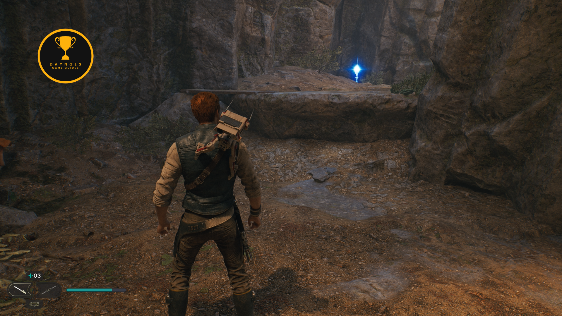 As you enter the cave, you’ll hear a conversation between a Raider and Droids. Before attacking them, look to your immediate left as you enter. Wall run up the left side and jump up to the ridge to find a Priorite Shard.