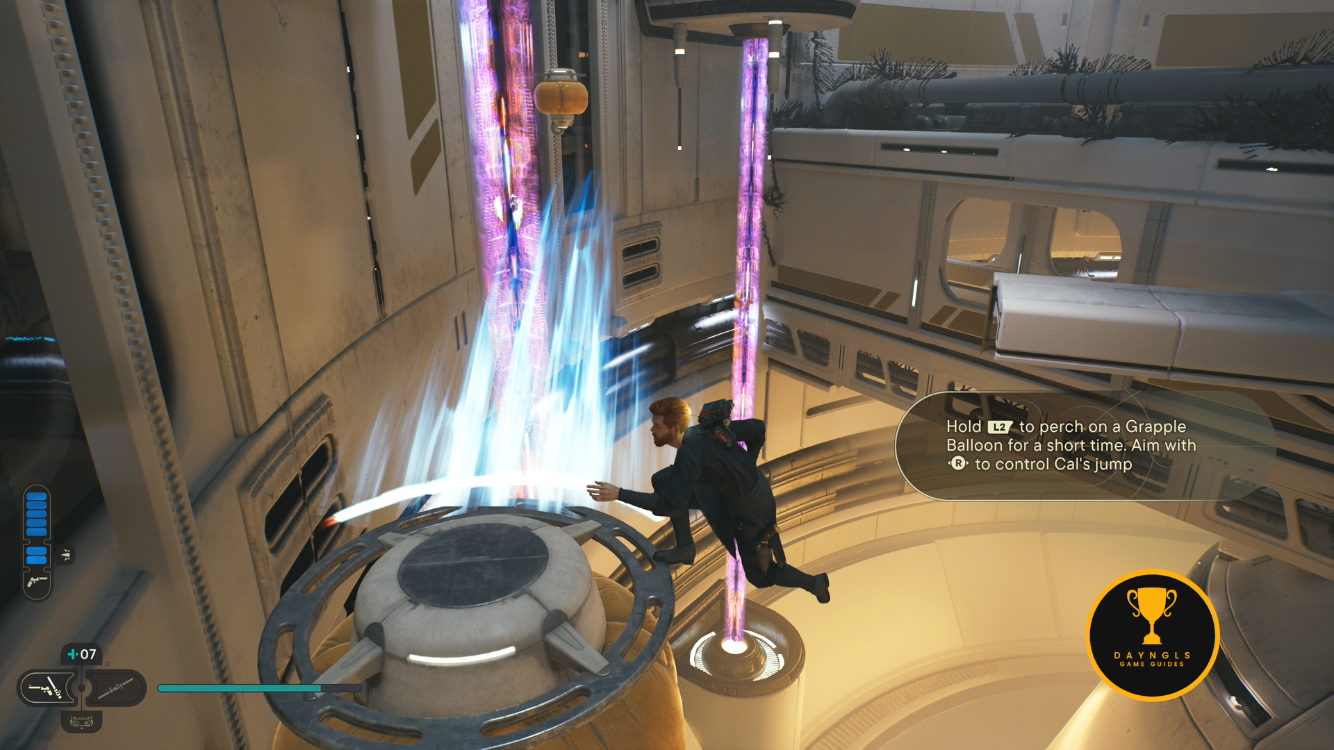 Speak to everyone and then leave the yacht. After the ensuing scene, you’ll regain control of Cal as he is falling. When you land on the conveyor belt, turn around jump to the horizontal pole by using the Ascension Cable. Jump from the pole to ledge on the left and make your way through the path. Jump up the wall by pressing