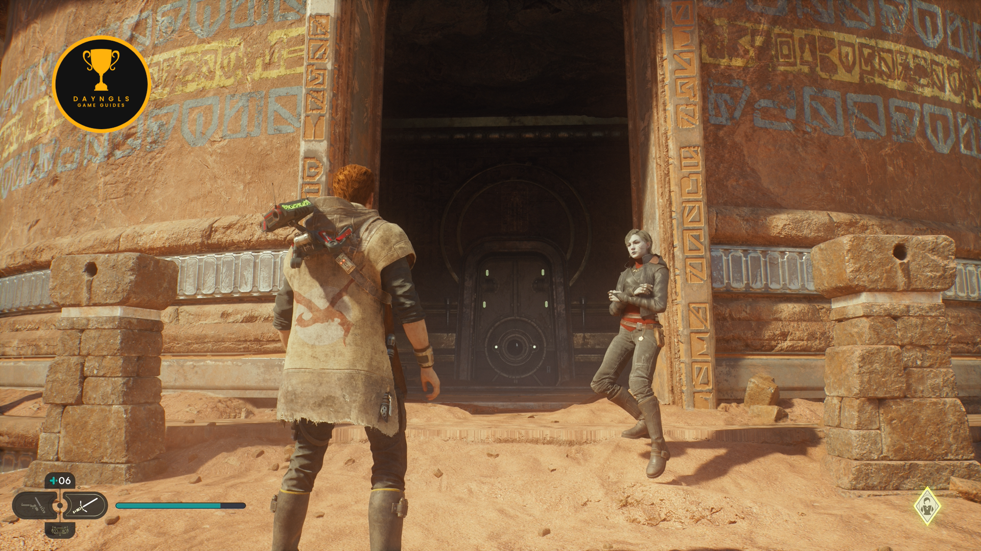 Climb up and follow the path to Merrin. Before speaking to her, pick up the Jedha Scroll on the ground near her.