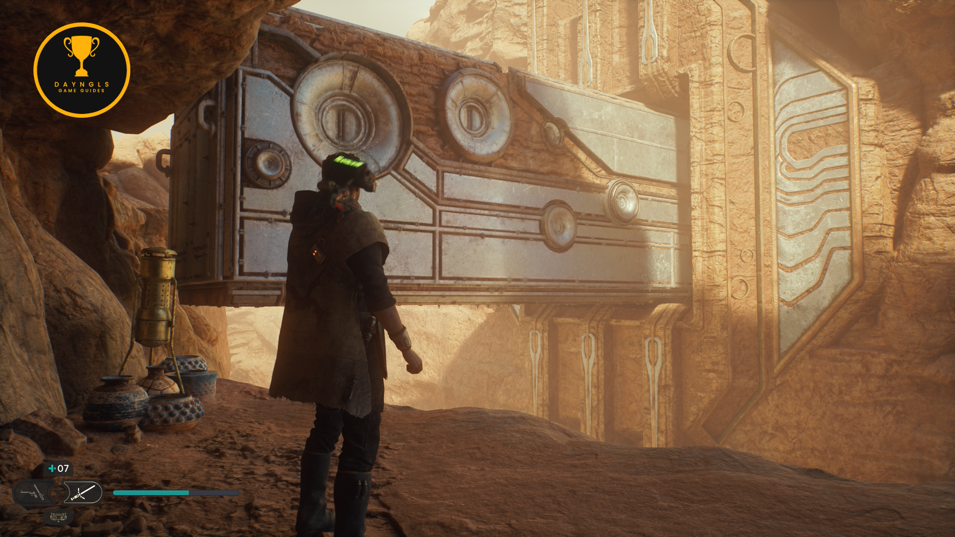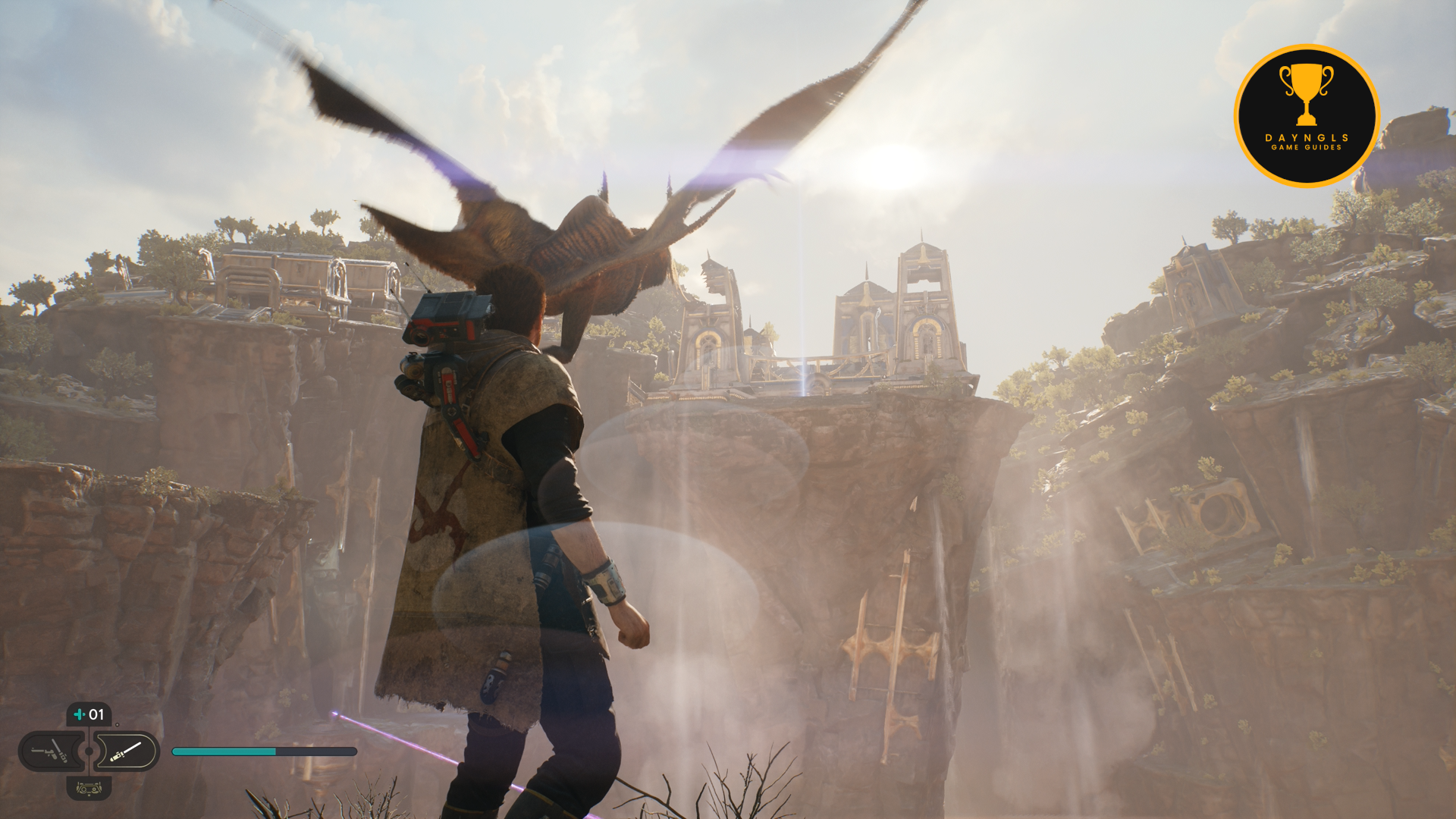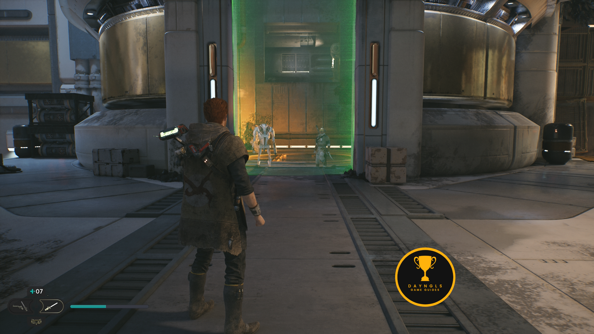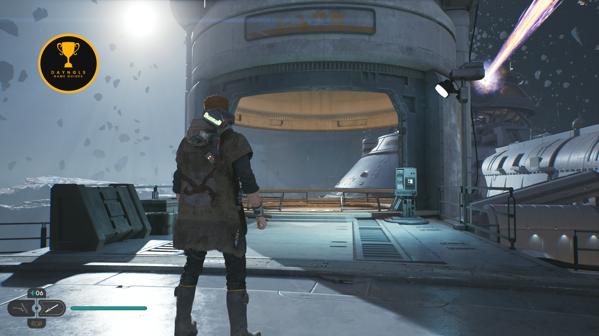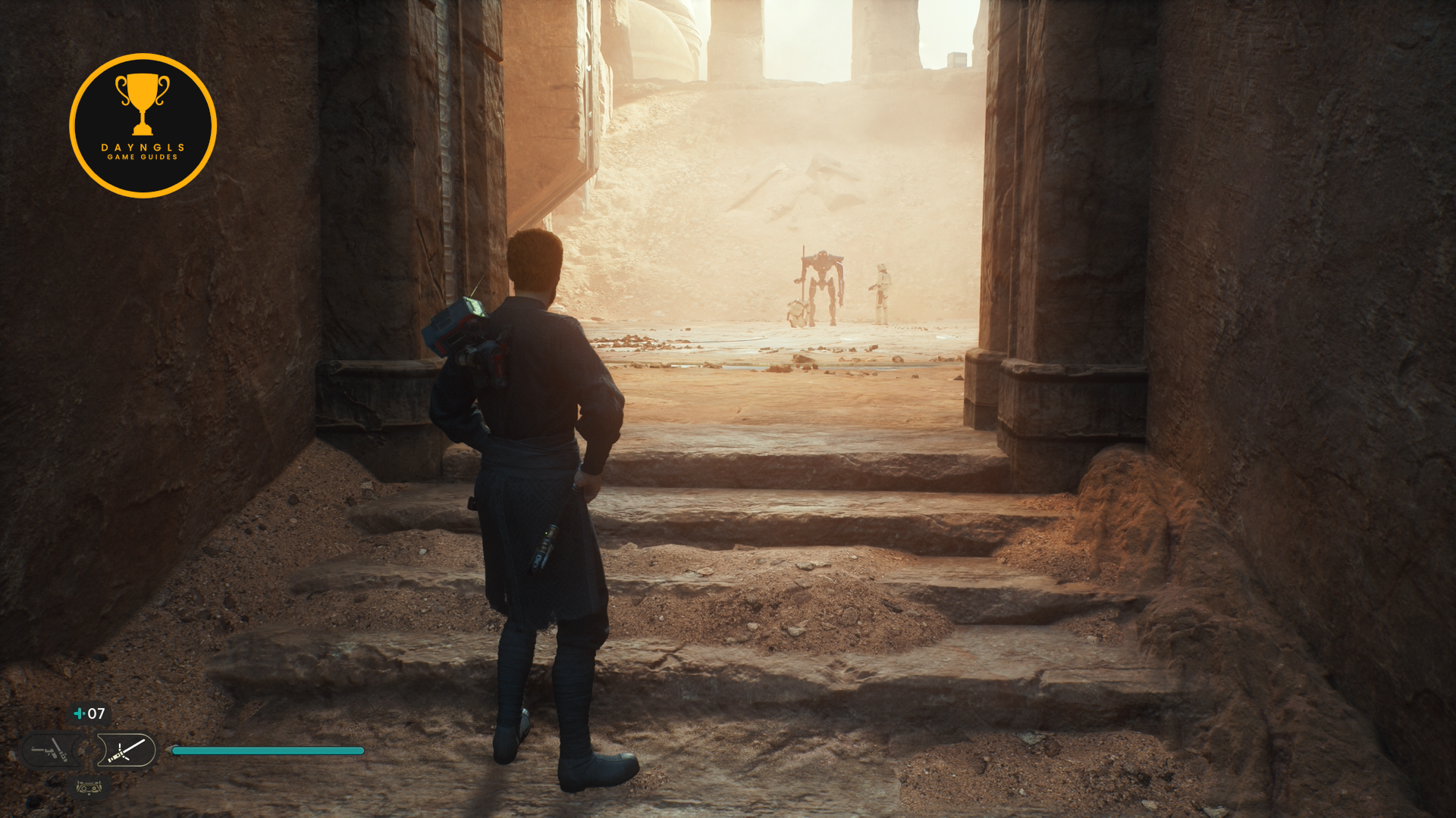 As soon as you land, go cut the cable to create a shortcut on the right and then turn around and you’ll see a Jedha Scroll on the ground opposite of the shortcut cable. Then, head left where you’ll encounter two Flametroopers.