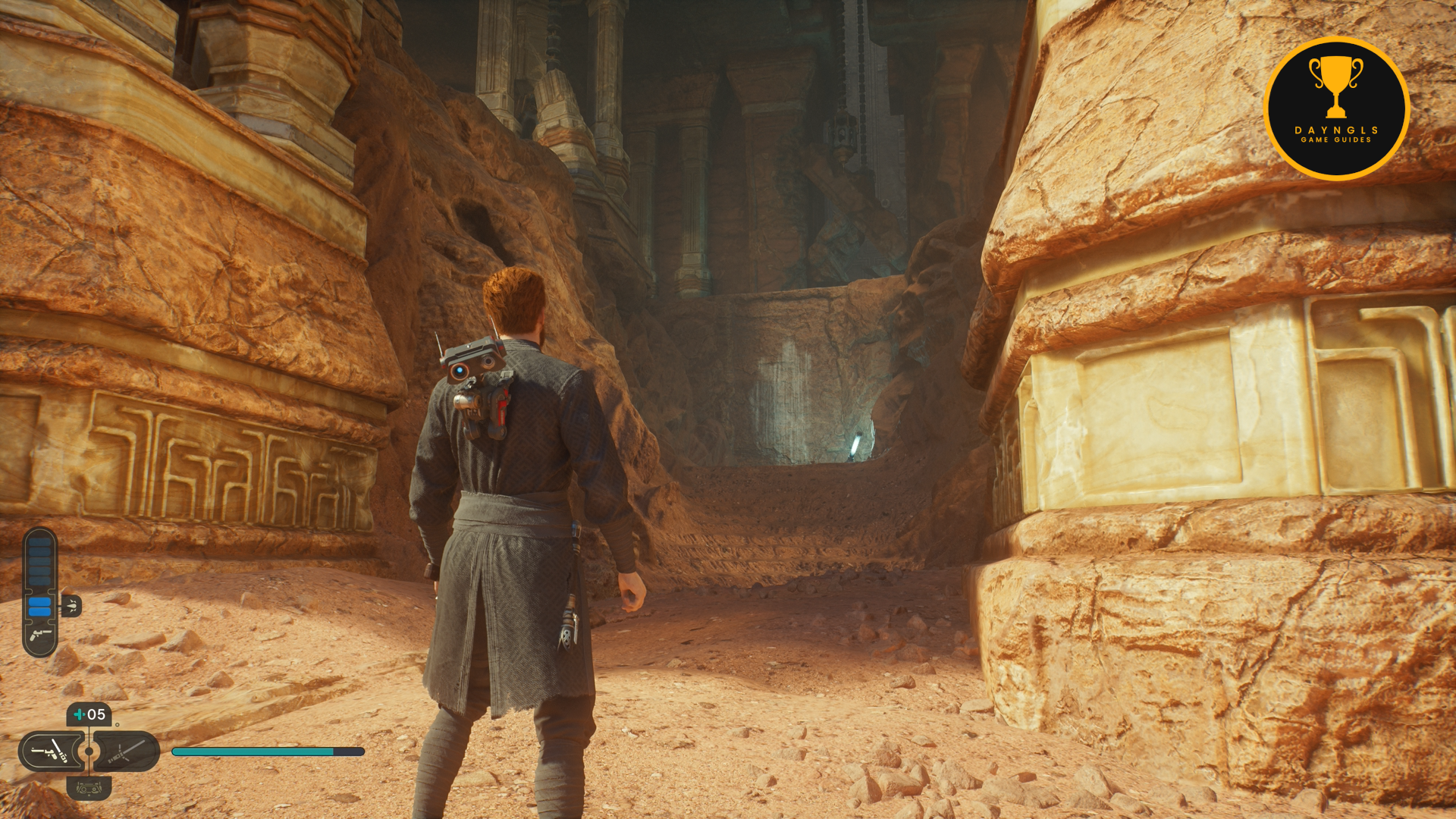 Before dropping down the shaft, wall jump up and you’ll find a Jedha Scroll.