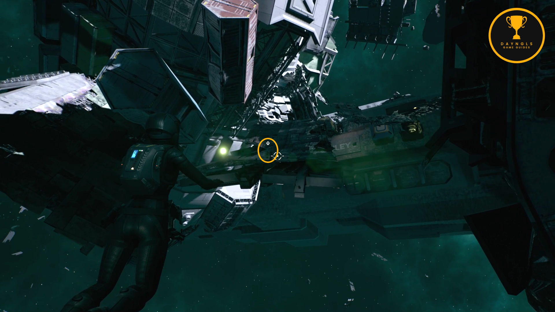 Progress through the episode a bit more until you come to the wreckage out in space. There will be a pulsing green light to your right. From that starting point, go out into space, fly up and turn around. You should see a pulsing red light at the top of the wreckage. Fly toward that and enter the piece of ship at that light. Once inside there, go straight back down a small set of steps and interact with the panel on the wall labeled, “Tight Beam Laser.” The Trophy/Achievement will pop after the short scene.