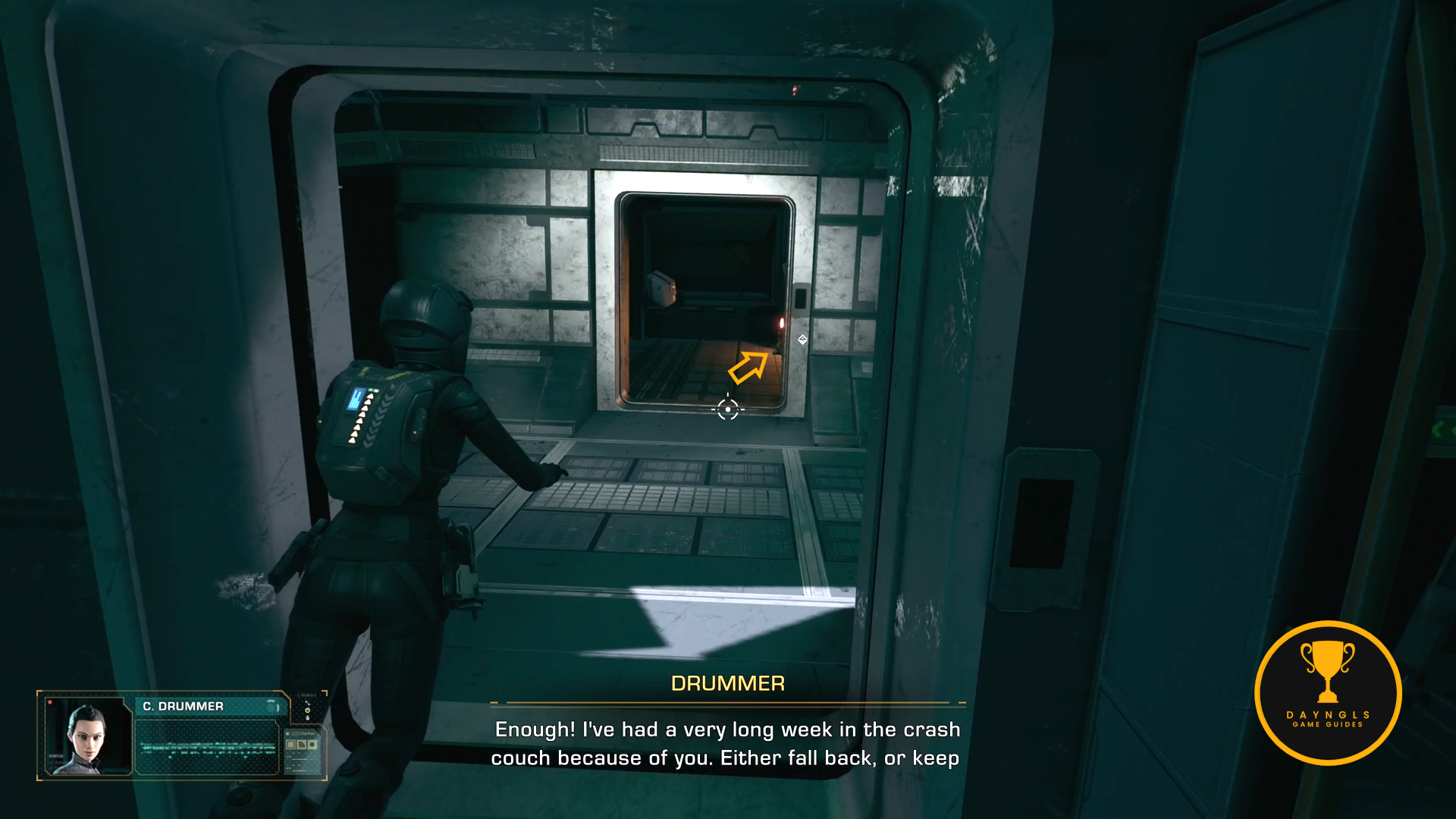 From the previous collectible, exit Cox’s room and go down the ladder to the Crew Deck. Head forward and then left into the Mess Hall. The rooms are labeled on the floor at the intersection. Arlen will be sleeping at a table. Approach him and select, “Medicine.”