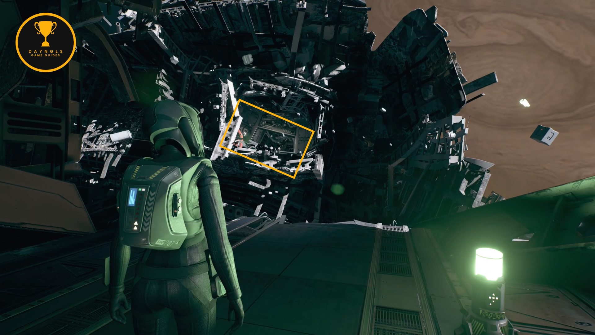 From the previous collectible, turn around and fly through the doorway with the two doors stuck half open. Fly straight across to the other side to find this salvage in an alcove.