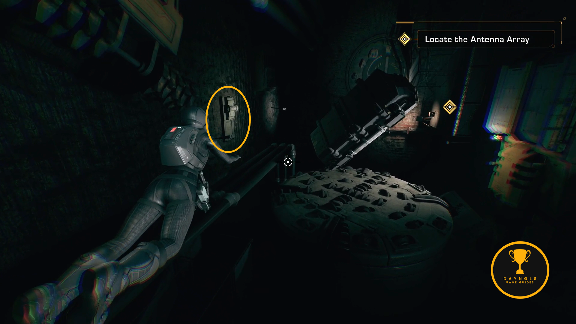 Progress through the episode a bit more until you come to the wreckage out in space. There will be a pulsing green light to your right. From that starting point, go out into space, fly up and turn around. You should see a pulsing red light at the top of the wreckage. Fly toward that and enter the piece of ship at that light. Once inside there, go straight back down a small set of steps and interact with the panel on the wall labeled, “Tight Beam Laser.” The Trophy/Achievement will pop after the short scene.